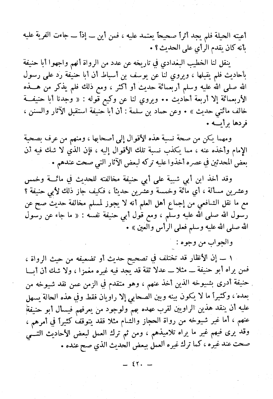 وقد أخذ ابن أبي شيبة على أبي حنيفة مخالفته للحديث في مائة وخمس وعشرين مسألة، أي مائة وخمسة وعشرين حَدِيثًا، فكيف جاز ذلك لأبي حنيفة؟ مع ما نقل الشافعي من إجماع أهل العلم أنه لا يجوز لمسلم مخالفة حديث صَحَّ عن رسول الله - صَلََّى اللهُ عَلَيْهِ وَسَلَّمَ -، ومع قول أبي حنيفة نفسه: «مَاجَاءَ عَنْ رَسُولِ اللهِ - صَلَّىَ الْلَّهُ عَلَيْهِ وَسَلَّمَ - فَعَلَى الرَّأْسِ وَالعَيْنِ».