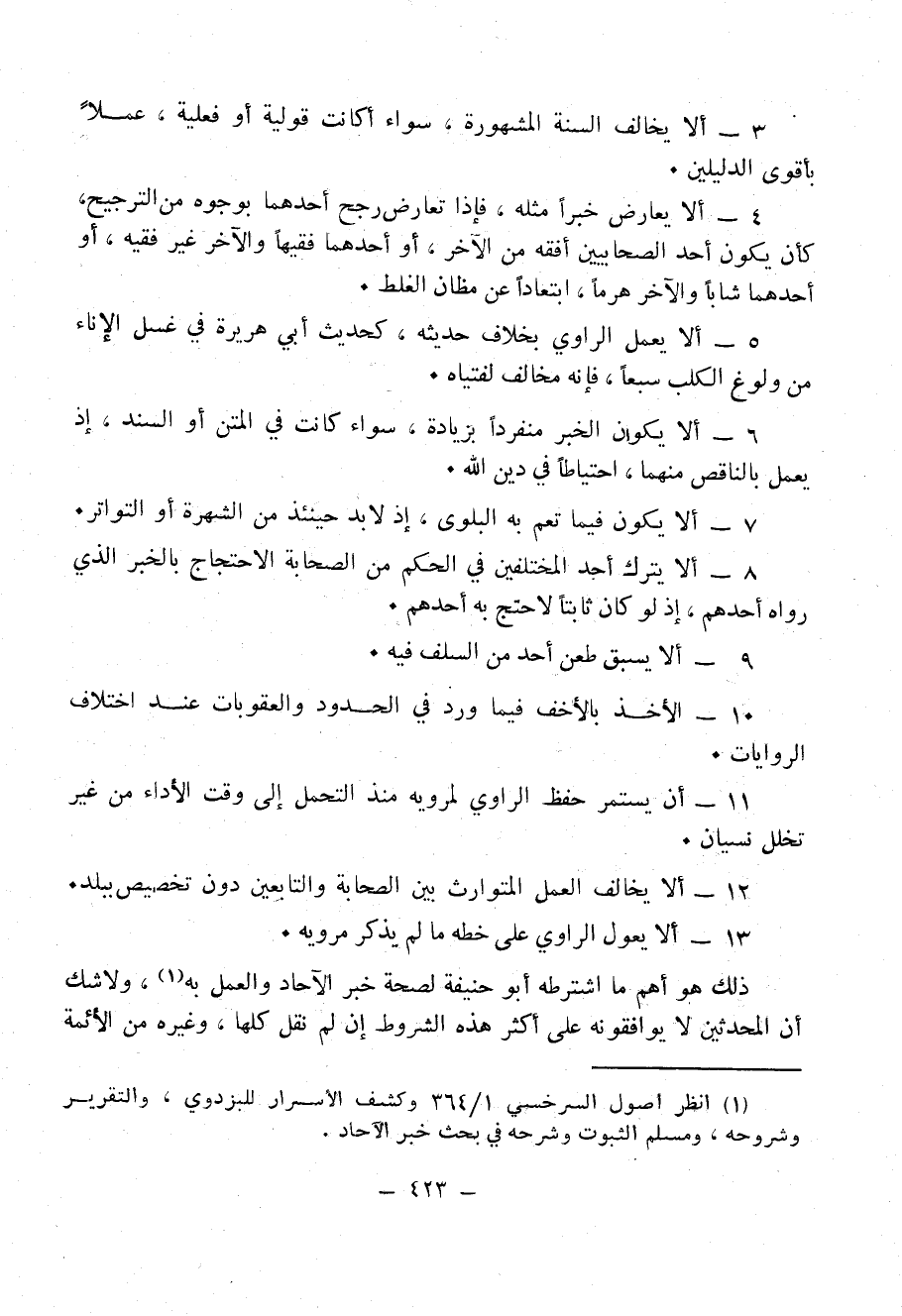 ذلك هو أهم ما اشترطه أبو حنيفة لصحة خبر الآحاد والعمل به (¬1)، ولاشك أن المُحَدِّثِينَ لا يوافقونه على أكثر هذه الشروط إن لم نقل كلها، وغيره من الأئمة