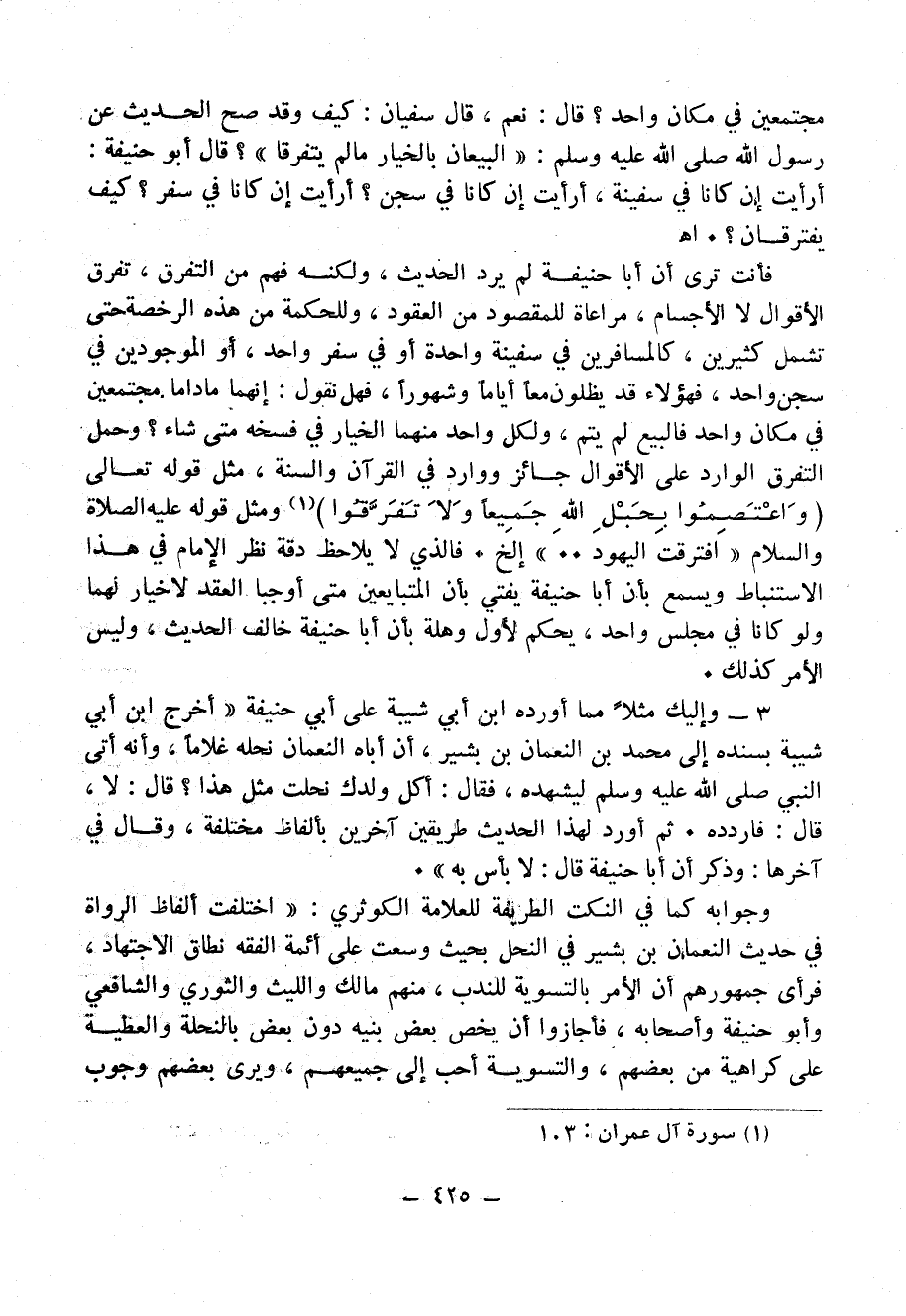 فأنت ترى أن أبا حنيفة لَمْ يَرُدَّ الحديث، ولكنه فهم من التفرق، تفرق الأقوال لا الأجسام، مُرَاعَاةً للمقصود من العقود، وللحكمة من هذه الرخصة تشمل كثيرين، كالمسافرين في سفينة واحدة أو في سفر واحد، أو الموجودين في سجن واحد، فهؤلاء قد يظلون معاً أياماً وشهوراً، فهل نقول: إنهما ما داما مجتمعين في مكان واحد فالبيع لم يتم، ولكل واحد منهما الخيار في فسخه متى شاء؟ وحمل التفرق الوارد على الأقوال جائز ووارد في القرآن وَالسُنَّةُِ، مثل قوله تعالى: {وَاعْتَصِمُوا بِحَبْلِ اللَّهِ جَمِيعًا وَلَا تَفَرَّقُوا} (¬1) ومثل قوله - عَلَيْهِ الصَلاَةُ وَالسَّلاَمُ - «افْتَرَقَتْ الْيَهُودُ ... » إلخ. فالذي لا يلاحظ دقة نظر الإمام في هذا الاستنباط ويسمع بأن أْبا حنيفة يُفْتِي بأن المتبايعين متى أوجبا العقد لا خيار لهما ولو كانا في مجلس واحد، يحكم لأول وهلة بأن أبا حنيفة خالف الحديث، وليس الأمر كذلك.