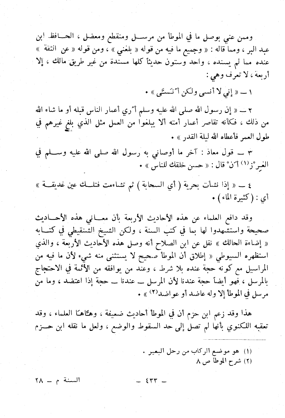 وقد دافع العلماء عن هذه الأحاديث الأربعة بأن معاني هذه الأحاديث صحيحة واستشهدوا لها بما في كُتُبِ السُنَّةِ، ولكن الشيخ الشنقيطي في كتابه " إضاءة الحالك " نقل عن ابن الصلاح أنه وصل هذه الأحاديث الأربعة، والذي استظهره السيوطي «إِطْلاَقُ أَنَّ " المُوَطَّأَ " صَحِيحٌ لاَ يَسْتَثْنِي مِنْهُ شَيْءٌ لأَنَّ مَا فِيهِ مِنَ المَرَاسِيلِ مَعَ كَوْنِهِ حُجَّةً عِنْدَهُ بِلاَ شَرْطٍ، وَعِنْدَ مَنْ يُوَافِقُهُ مِنْ الأَئِمَّةِ فِي الاحْتِجَاجِ بِالمُرْسَلِ، فَهُوَ أَيْضًا حُجَّةَ عِنْدَنَا لأَنَّ الْمُرْسَلَ - عِنْدَنَا - حُجَّةَ إِذَا اعْتُضِدَ، وَمَا مِنْ مُرْسَلٍ فِيْ " المُوَطَّأَ " إِلاَّ وَلَهُ عَاضِدٌ أَوْ عَواضِدَ» (¬2).