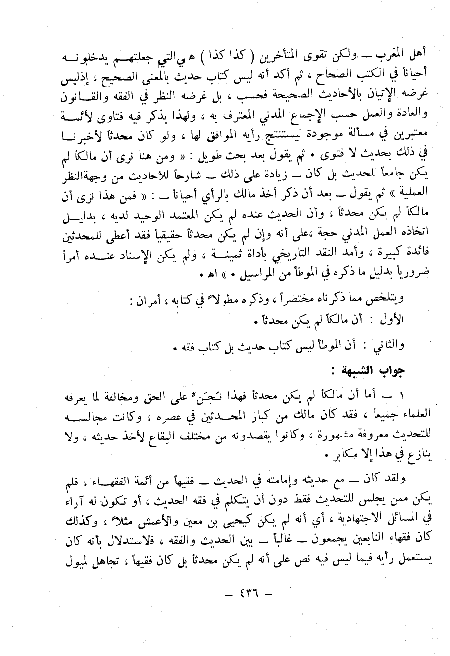 1 - أما أن مالكاً لم يكن مُحَدِّثاً فهذا تَجَنٍّ، على الحق ومخالفة لما يعرفه العلماء جميعاً، فقد كان مالك من كبار المُحَدِّثِينَ في عصره، وكانت مجالسه للتحديث معروفة مشهورة، وكانوا يقصدونه من مختلف البقاع لأخذ حديثه، ولا ينازع في هذا إلا مكابر.