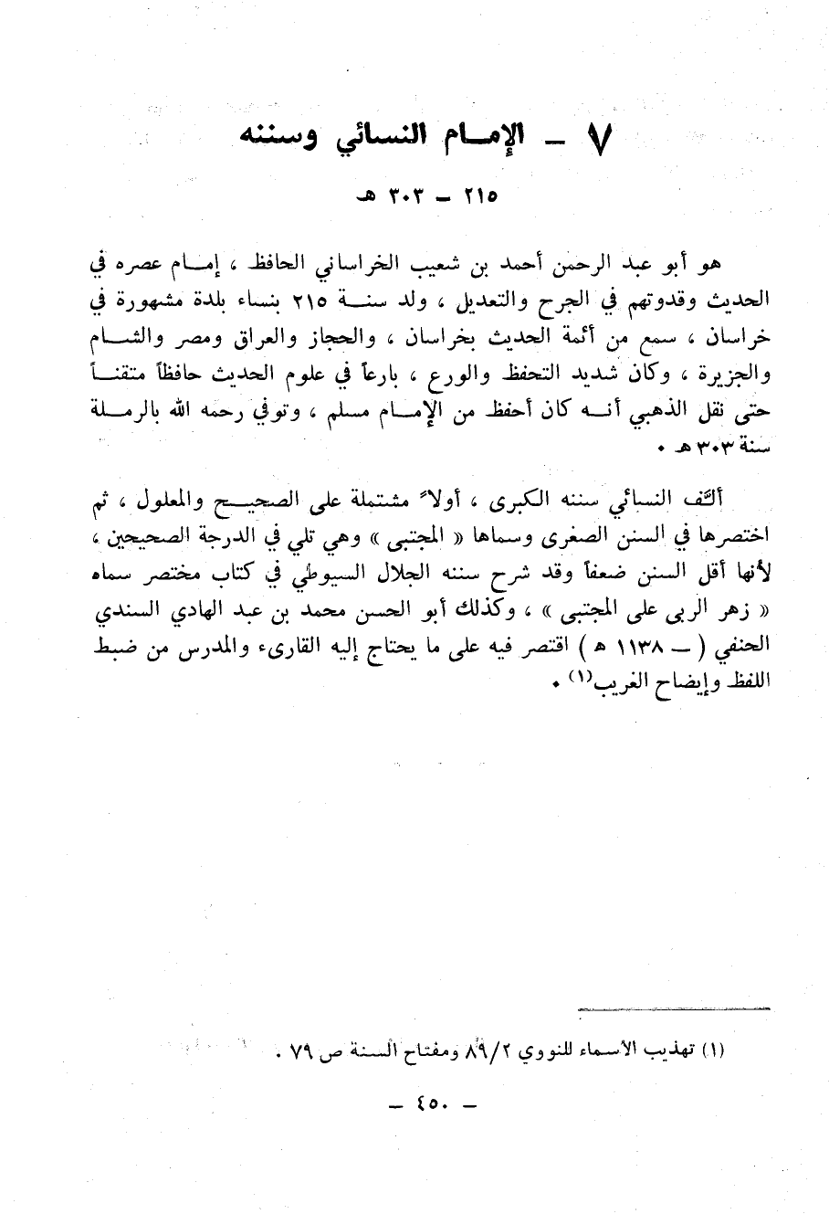 أَلَّفَ النَّسَائِيُّ "سُنَنَهُ الكُبْرَى "، أولاً مشتملة على الصحيح والمعلول، ثم اختصرها في " السُنَنِ الصُّغْرَى " وسماها " المُجْتَبَى " وهي تلي في الدرجة " الصَحِيحَيْنِ "، لأنها أقل السنن ضعفاً وقد شرح " سُنَنَهُ " الجلال السيوطي في كتاب مختصر سَمَّاهُ " زَهْرُ الرُّبَى عَلَى المُجْتَبَى "، وكذلك أبو الحسن محمد بن عبد الهادي السِنْدِي الحَنَفِي (- 1138 هـ) اقتصر فيه على ما يحتاج إليه القَارِىءُ وَالمُدَرِّسُ من ضبط اللفظ وإيضاح الغريب (¬1)