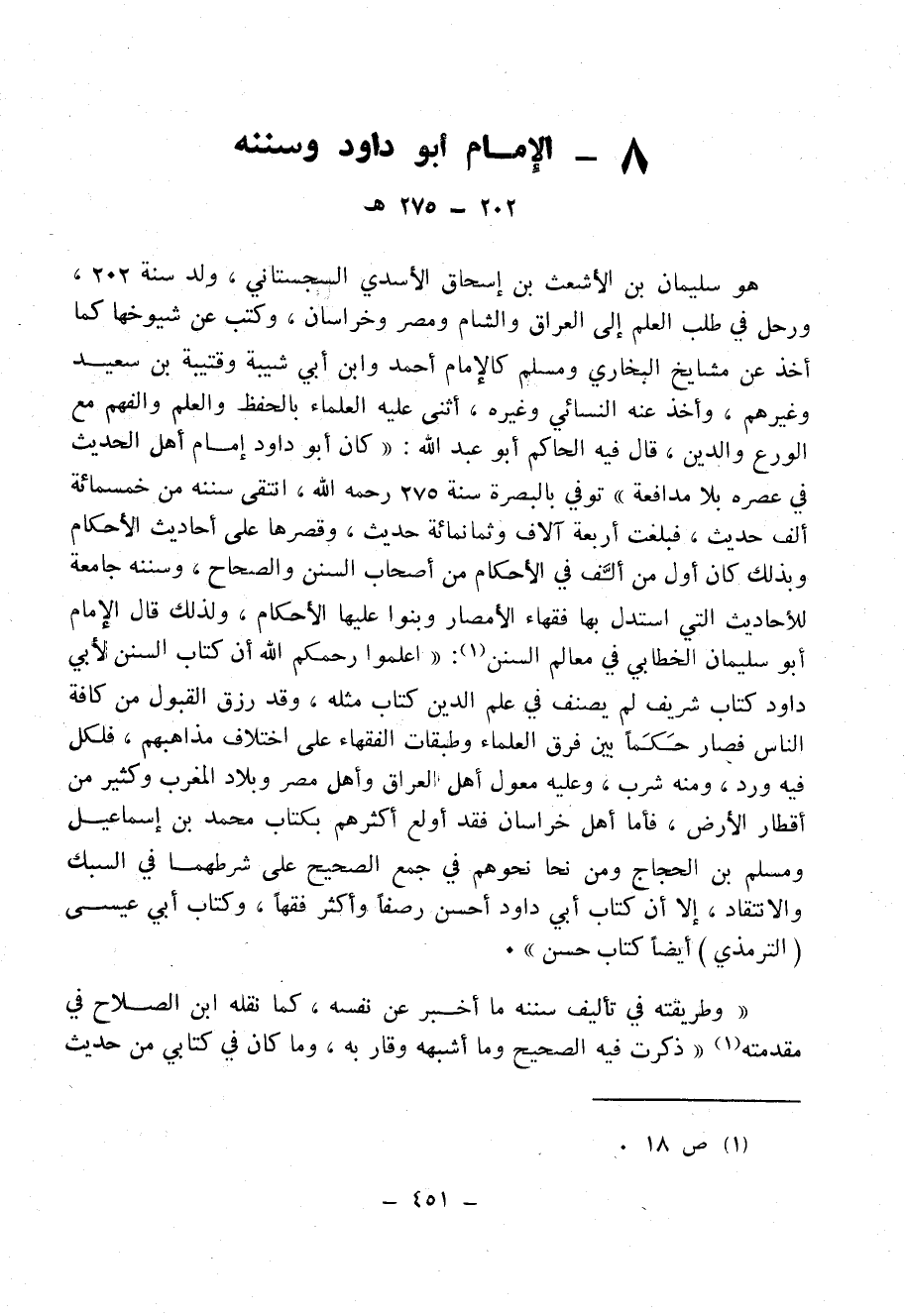 هو سليمان بن الأشعث بن إسحاق الأسدي السجستاني، ولد سَنَةَ 202، ورحل في طلب العلم إلى العراق والشام ومصر وخراسان، وكتب عن شيوخها كما أخذ عن مشايخ البخاري ومسلم كالإمام أحمد وابن أبي شيبة وقتيبة بن سعيد وغيرهم وأخذ عنه النسائي وغيره، أثنى عليه العلماء بالحفظ والعلم والفهم مع الورع والدين، قال فيه الحاكم أبو عبد الله: «كَانَ أَبُو دَاوُدُ إِمَامَ أَهْلِ الحَدِيثِ فِي عَصْرِهِ بِلاَ مُدَافَعَةٍ» توفي بالبصرة سَنَةَ 275 - رَحِمَهُ اللهُ -، انتقى " سُنَنَهُ " من خمسمائة ألف حديث، فبلغت أربعة آلاف وثمانمائة حديث، وقصرها على أحاديث الأحكام وبذلك كان أول من أَلَّفَ في الأحكام من أصحاب السُنن والصحاح، وَ" سُنَنُهُ " جامعة للاحاديث التي استدل بها فقهاء الأمصار وَبَنَوْا عليها الأحكام، ولذلك قال الإمام أبو سليمان الخَطَّابِي في " معالم السُنن " (¬1): «اعْلَمُوا رَحِمَكُمْ اللهُ أَنَّ كِتَابَ " السُّنَنِ " لأَبِي دَاوُدَ كِتَابٌ شَرِيفٌ لَمْ يُصَنَّفْ فِي عِلْمِ الدِّينِ كِتَابٌ مِثْلُهُ، وَقَدْ رُزِقَ القَبُولَ مِنْ كَافَةِ النَّاسِ فَصَارَ حُكْمًا بَيْنَ فِرَقِ العُلَمَاءِ وَطَبَقَاتِ الفُقَهَاءِ عَلَى اخْتِلاَفِ مَذَاهِبِهِمْ، فَلِكُلٍّ فِيهِ وِرْدٌ، وَمِنْهُ شِرْبٌ، وَعَلَيْهِ مُعَوَّلُ أَهْلِ العِرَاقِ وَأَهْلِ مِصْرَ وَبِلاَدِ المَغْرِبِ وَكَثِيرٌ مِنْ أَقْطَارِ الأَرْضِ فَأَمَّا أَهْلُ خُرَاسَانَ فَقَدْ أُولِعَ أَكْثَرُهُمْ بِكِتَابِ مُحَمَّدٍ بْنِ إِسْمَاعِيلَ وَمُسْلِمٍ بْنِ الحَجَّاجِ وَمَنْ نَحَا نَحْوَهُمْ فِي جَمْعِ الصَّحِيحِ عَلَى شَرْطِهِمَا فِي السَّبْكِ وَالانْتِقَادِ، إِلاَّ أَنَّ كِتَابَ أَبِي دَاوُدَ أَحْسَنُ وَصْفًا وَأَكْثَرُ فِقْهًا، وَكِتَابُ أَبِي عِيسَى (التِّرْمِذِيُّ) أَيْضًا كِتَابٌ حَسَنٌ».