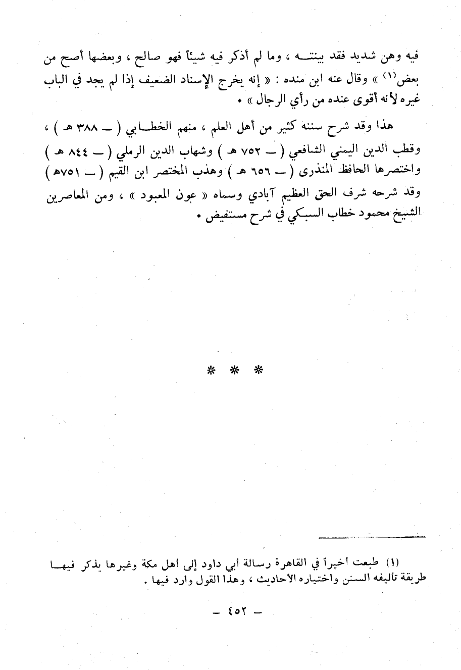 (¬1) طبعت أخيراً في القاهرة " رسالة أبي داود إلى أهل مكة وغيرها " يذكر فيها طريقة تأليفه " السُنَنَ " واختياره الأحاديث، وهذا القول وارد فيها.