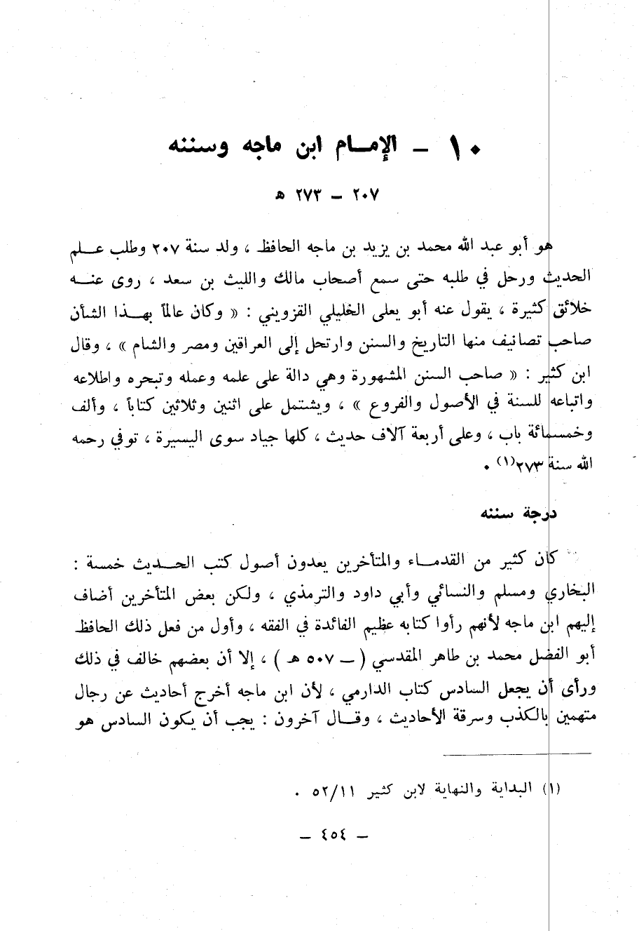 كان كثير من القدماء والمتأخرين يعدون أصول كتب الحديث خمسة: البخاري ومسلم والنسائي وأبي داود والترمذي، ولكن بعض المتاخرين أضاف إليهم ابن ماجه لأنهم رأوا كتابه عظيم الفائدة في الفقه، وأول من فعل ذلك الحافظ أبو الفضل محمد بن طاهر المقدسي (- 507 هـ.)، إلا أن بعضهم خالف في ذلك ورأى أن يجعل السادس " كتاب الدارمي "، لأن ابن ماجه أخرج أحاديث عن رجال مُتَّهَمِينَ بالكذب وسرقة الأحاديث، وقال أخرون: يجب أن يكون السادس هو
