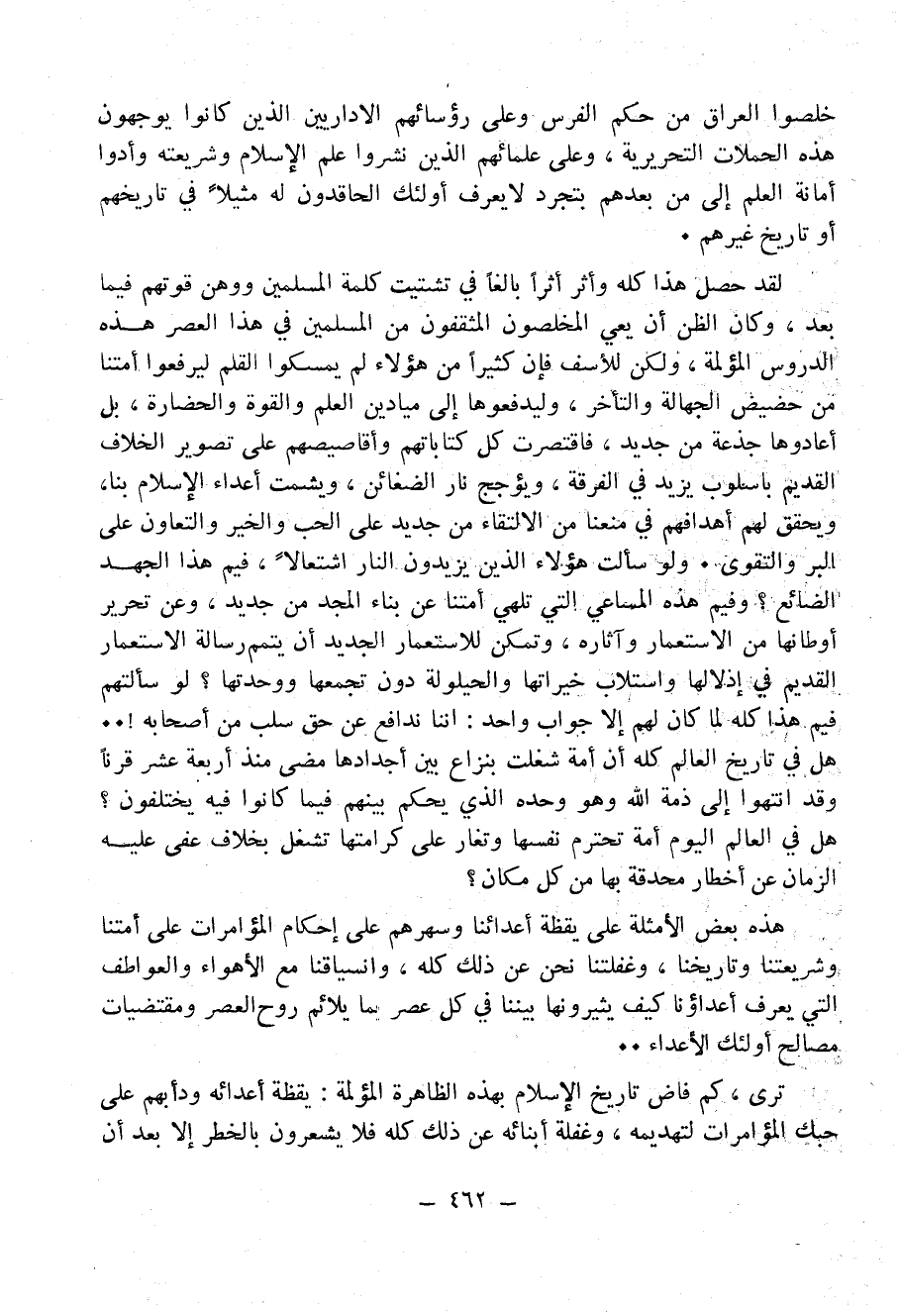 لقد حصل هذا كله وأثَّرَ أثراً بالغاً في تشتيت كلمة المُسْلِمِينَ ووهن قوتهم فيما بعد، وكان الظن أن يعي المخلصون المثقفون من المُسْلِمِينَ في هذا العصر هذه الدروس المؤلمة، ولكن للأسف فإن كثيراً من هؤلاء لم يمسكوا القلم ليرفعوا، أُمَّتَنَا من حضيض الجهالة والتأخر، وليدفعوها إلى ميادين العلم والقوة والحضارة، بل أعادوها جذعةً من جديد، فاقتصرت على كتاباتهم وأقاصيصهم على تصوير الخلاف القديم بأسلوب يزيد في الفرقة، ويؤجج نار الضغائن، ويشمت أعداء الإسلام بنا، ويحقق لهم أهدافهم في منعنا من الالتقاء من جديد على الحب والخير والتعاون على البر والتقوى. ولو سألت هؤلاء الذين يزيدون النار اشتعالاً، فِيمَ هَذَا الجهد الضائع؟ وفيم هذه المساعي التي تلهي أُمَّتَنَا عن بناء المجد من جديد، وعن تحرير أوطانها من الاستعمار وآثاره، وتمكن للاستعمار الجديد أن يُتَمِّمَ رسالة الاستعمار القديم في إذلالها واستلاب خيراتها والحيلولة دُونَ تجمعها ووحدتها؟ لو سألتهم فيم هذا كله لما كان لهم إلا جواب واحد: إننا ندافع عن حق سلب من أصحابه! .. هل في تاريخ العالم كله أن أُمَّةً شغلت بنزاع بين أجدادها مضى منذ أربعة عشر قرناً وقد أنتهوا إلى ذمَّةِ الله وهو وحده الذي يحكم بينهم فيما كانوا فيه يختلفون؟ هل في العالم اليوم أُمَّةٌ تحترم نفسها وتغار على كرامتها تشغل بخلاف عفى عليه الزمان عن أخطار محدقة بها من كل مكان؟