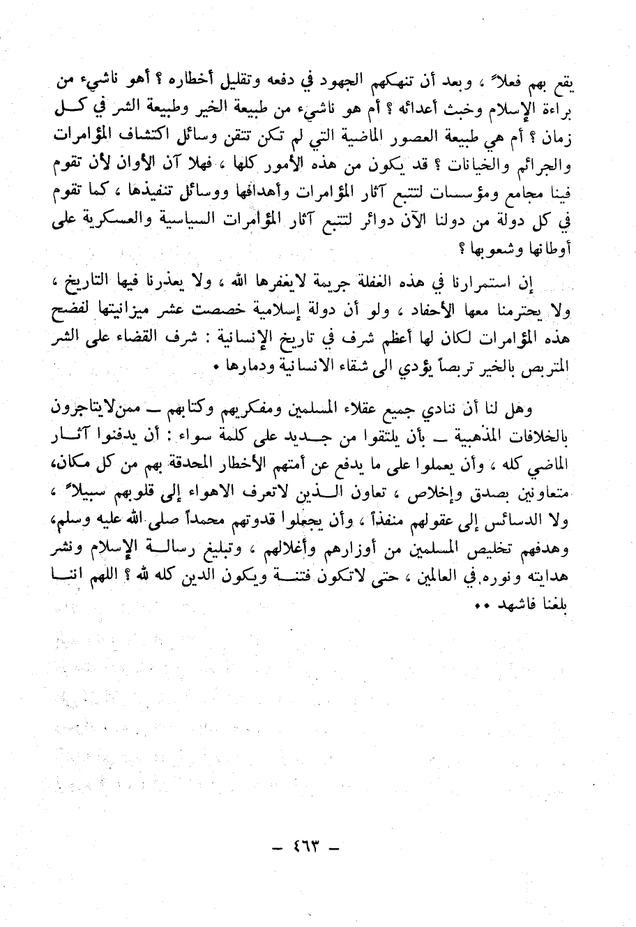 وهل لنا أن ننادي جميع عقلاء المُسْلِمِينَ ومفكريهم وَكُتَّابِهِمْ - مِمَّنْ لا يُتاجرون بالخلافات المذهبية - بأن يلتقوا من جديد على كلمة سواء: أن يدفنوا آثار الماضي كله، وأن يعملوا على ما يدفع الأخطار المحدقة بهم من كل مكان، متعاونين بصدق وإخلاص، تعاون الذين لا تعرف الأهواء إلى قلوبهم سبيلاً، ولا الدسائس إلى عقولهم مَنْفَذًا، وأن يجعلوا قدوتهم محمداً - صَلََّى اللهُ عَلَيْهِ وَسَلَّمَ -، وهدفهم تخليص المُسْلِمِينَ من أوزارهم وأغلالهم، وتبليغ رسالة الإسلام ونشر هدايته ونوره للعالمين، حتى لا تكون فتنة ويكون الدين كله لله؟ اللهم إننا بلَّغْنا فاشهد ..