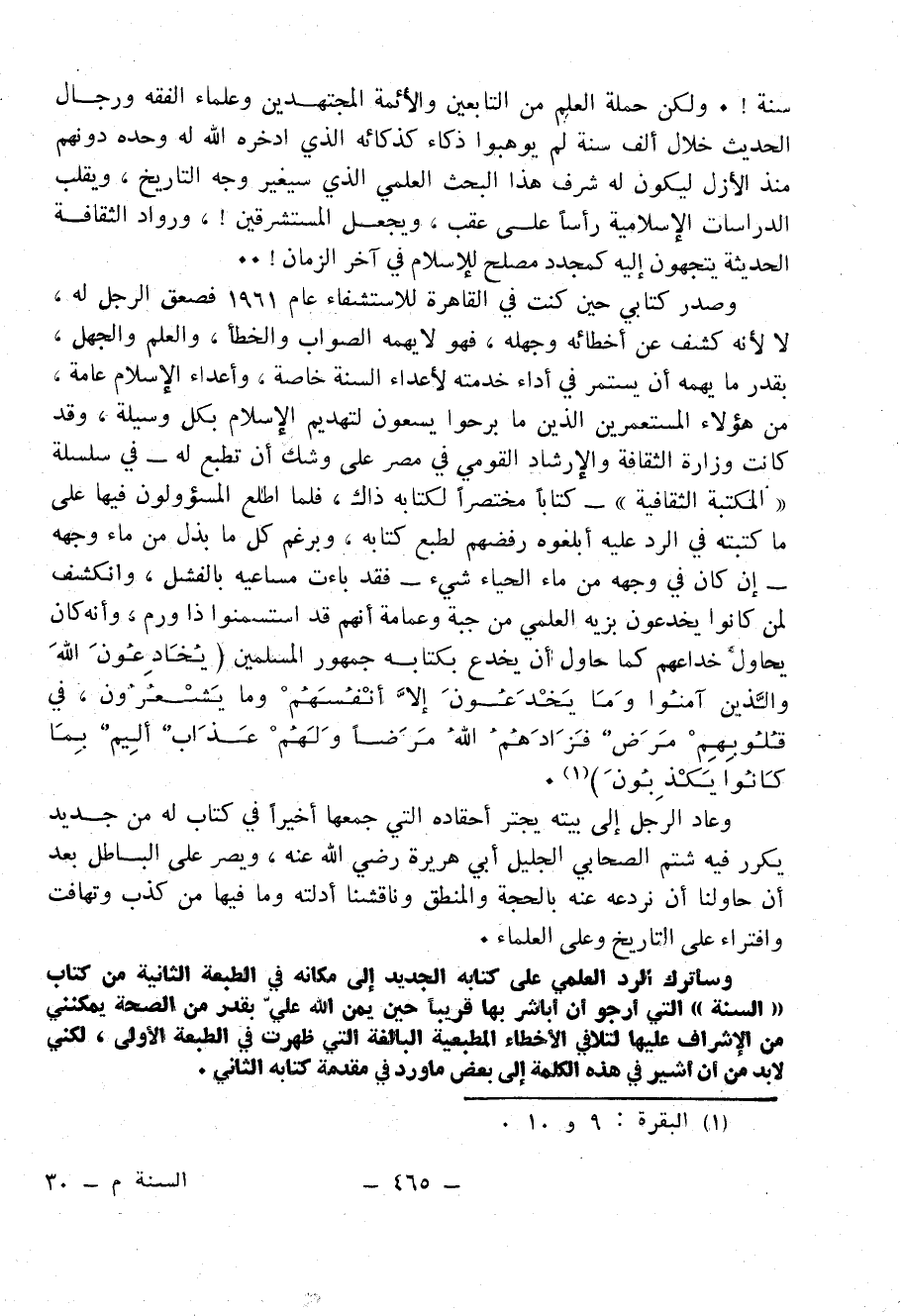 - وصدر كتابي حين كنت في القاهرة للاستشفاء عام 1961 فصعق الرجل له، لا لأنه كشف عن أخطائه وجهله، فهو لا يهمه الصواب والخطأ، والعلم والجهل، بقدر ما يهمه أن يستمر في أداء خدمته لأعداء السُنَّةِ خاصة، وأعداء الإسلام عامة، من هؤلاء المُسْتَعْمِرِينَ الذين ما برحوا يسعون لتهديم الإسلام بكل وسيلة، وقد كانت وزارة الثقافة والإرشاد القومي في مصر على وشك أن تطبع له - في سلسلة «المكتبة الثقافية» - كتاباً مختصراً لكتابه ذاك، فلما اطلع المسؤولون فيها على ما كتبته في الرد عليه أبلغوه رفضهم لطبع كتابه، وبرغم كل ما بذل من ماء وجهه - إن كان في وجهه من ماء الحياء شيء - فقد باءت مساعيه بالفشل، وانكشف لمن كانوا يخدعون بزيه العلمي من جبة وعمامة أنهم قد استسمنوا ذا ورم، وأنه كان يحاول خداعهم كما حاول أن يخدع بكتابه جمهور المُسْلِمِينَ {يُخَادِعُونَ اللَّهَ وَالَّذِينَ آمَنُوا وَمَا يَخْدَعُونَ إِلاَّ أَنْفُسَهُمْ وَمَا يَشْعُرُونَ، فِي قُلُوبِهِمْ مَرَضٌ فَزَادَهُمُ اللَّهُ مَرَضًا وَلَهُمْ عَذَابٌ أَلِيمٌ بِمَا كَانُوا يَكْذِبُونَ} (¬1).