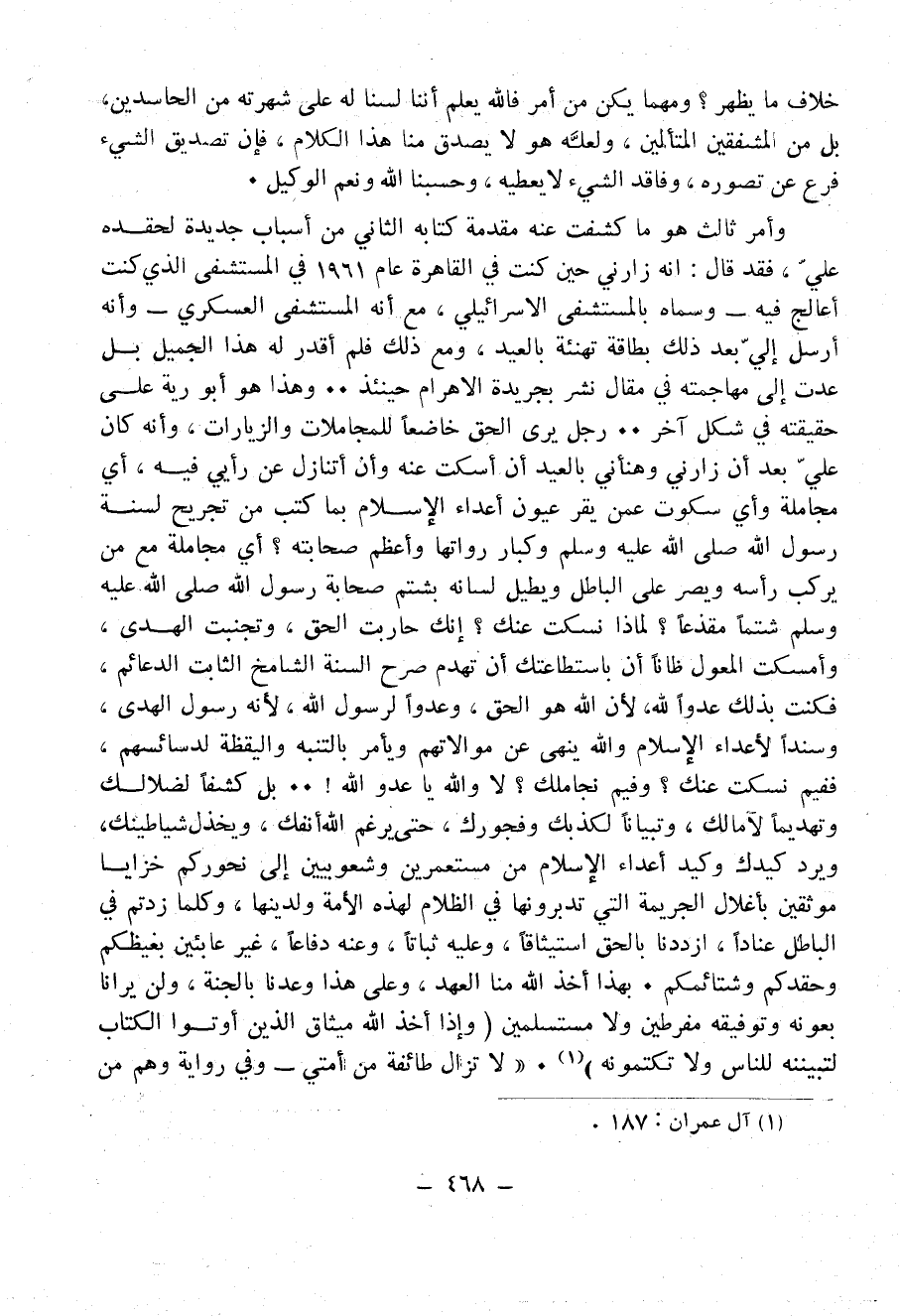 وأمر ثالث هو ما كشفت عنه مقدمة كتابه الثاني من أسباب جديدة لحقده عَلََيَّ، فقد قال: إنه زارني حين كنتُ في القاهرة عام 1961 في المستشفى الذي كنت أعالج فيه - وسماه بالمستشفى الإسرائيلي، مع أنه المستشفى العسكري - وأنه أرسل إِلَيَّ بعد ذلك بطاقة تهنئة بالعيد، ومع ذلك فلم أقدر له هذا الجميل بل عُدْتُ إلى مهاجمته في مقال نشر بجريدة " الأهرام " حينئذ .. وهذا هو أَبُو رَيَّةَ على حقيقته في شكل آخر .. رجل يرى الحق خاضعاً للمجاملات والزيارات، وأنه كان عَلََيَّ بعد أن زارني وَهَنَّأَنِي بالعيد أن أسكت عنه وأن أتنازل عن رأيي فيه، أي مجاملة وأي سكوت عمن يقر عيون أعداء الإسلام بما كتب من تجريح لِسُنَّةِ رسول الله - صَلََّى اللهُ عَلَيْهِ وَسَلَّمَ - وكبار رُوَّاتِهَا وأعظم صحابته؟ أي مجاملة مع من يركب رأسه وَيُصِرُّ على الباطل ويطيل لسانه بشتم صحابة رسول الله - صَلََّى اللهُ عَلَيْهِ وَسَلَّمَ - شتماً مقذعاً؟ لماذا نسكت عنك؟ إنك حاربت الحق، وَتجَنَّبْتَ الهُدَى، وأمسكت المعول ظاناً أن باستطاعتك أن تهدم صرح السُنَّةِ الشامخ الثابت الدعائم، فكنت بذلك عَدُوًّا للهِ، لأن الله هو الحق، وَعَدُوًّا لرسول الله، لأنه رسول الهدى، وسنداً لأعداء الإسلام والله ينهى عن موالاتهم ويأمر بالتنبه واليقظة لدسائسهم، ففيم نسكت عنك؟ وفيم نجاملك؟ لا والله يا عدو الله! .. بل كشفاً لضلالك وتهديماً لآمالك، وتبياناً لكذبك وفجورك، حتى يرغم الله أنفك، ويخذل شياطينك، ويرد كيدك وكيد أعداء الإسلام من مُسْتَعْمِرِينَ وَشُعُوبِيِّينَ إلى نحوركم خزايا موثَّقين بأغلال الجريمة التي تدبرونها في الظلام لهذه الأمَّة ولدينها، وكلما زدتم في الباطل عناداً، ازددنا بالحق استيثاقاً، وعليه ثباتاً، وعنه دفاعاً، غير عابئين بغيظكم وحقدكم وشتائمكم. بهذا أخذ الله منا العهد، وعلى هذا وعدنا بالجنة، ولن يرانا بعونه وتوفيقه مفرطين ولا مستسلمين {وَإِذْ أَخَذَ اللَّهُ مِيثَاقَ الَّذِينَ أُوتُوا الْكِتَابَ لَتُبَيِّنُنَّهُ لِلنَّاسِ وَلَا تَكْتُمُونَهُ} (¬1). «لاَ تَزَالُ طَائِفَةٌ مِنْ أُمَّتِي - وفي رواية " وهم من
