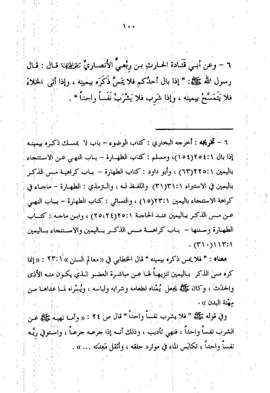 6 - تخريجه: أخرجه البخاري: كتاب الوضوء - باب لا يمسك ذكره بيمينه إذا بال 1: 254 (154)، ومسلم: كتاب الطهارة - باب النهي عن الاستنجاء باليمين 1: 225 (63)، وأبو داود: كتاب الطهارة - باب كراهية مس الذكر باليمين في الاستبراء 1: 31 (31) واللفظ له، والترمذي: الطهارة - ما جاء في كراهة الاستنجاء باليمين 1: 23 (15)، والنسائى: كتاب الطهارة - باب النهي عن مس الذكر باليمين عند الحاجة 1: 25 (24، 25)، وابن ماجه: كتاب الطهارة وسننها - باب كراهة مس الذكر باليمين والاستنجاء باليمين 1: 113 (310).