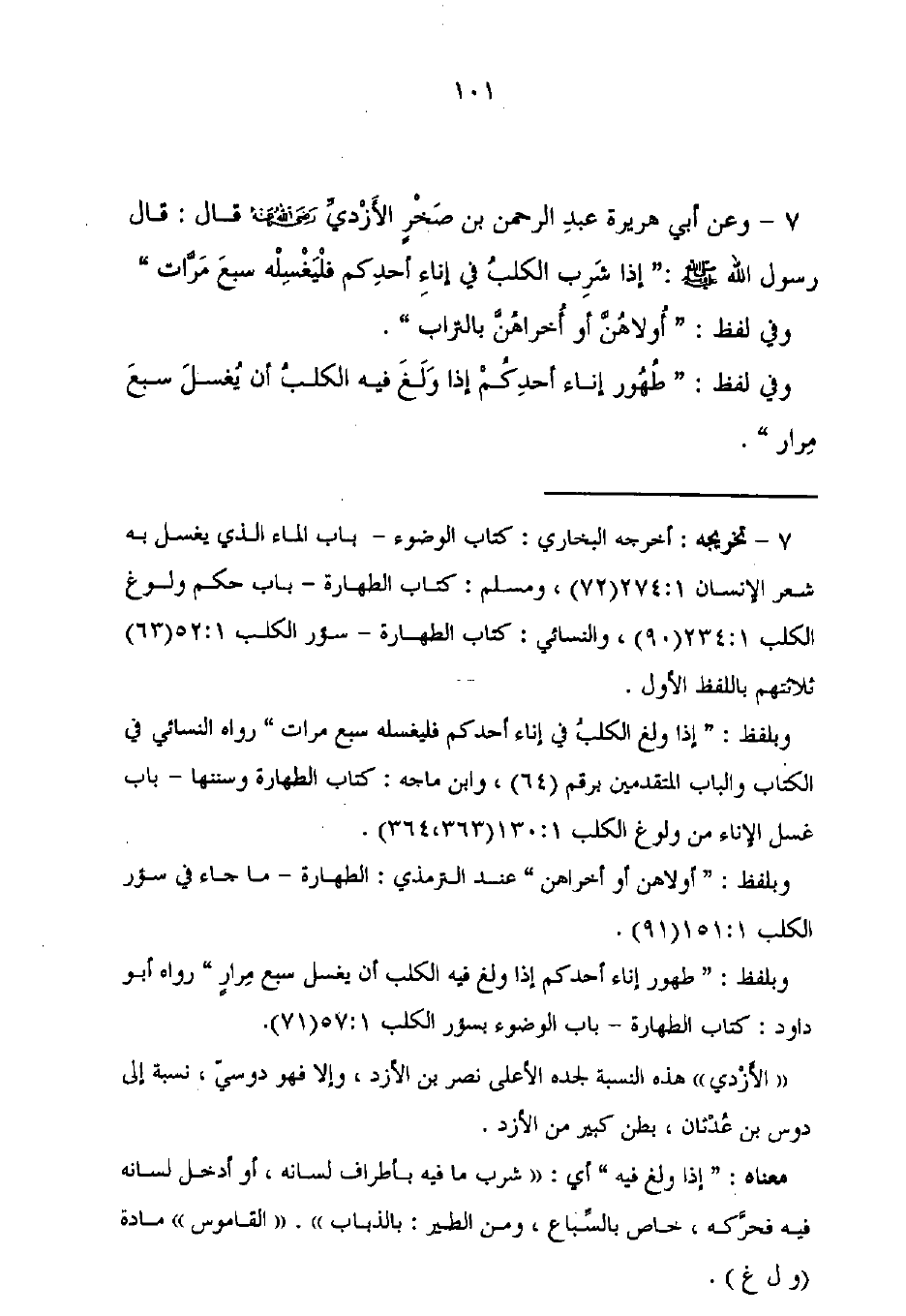 7 - وعن أبي هريرة عبدِ الرحمن بن صَخْرٍ الأَزْديِّ - رضي الله عنه - قال: قال رسول الله - صلى الله عليه وسلم -: "إذا شَرِب الكلبُ في إناءِ أحدِكم فلْيَغْسِلْه سبعَ مَرَّات"