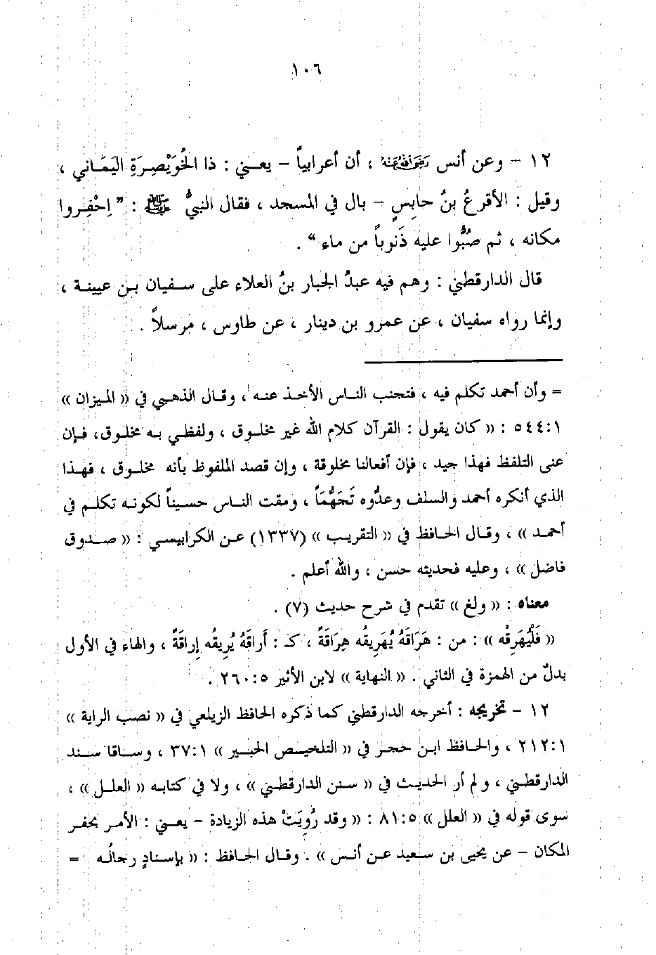 12 - وعن أنس - رضي الله عنه -، أن أعرابيًا -يعني: ذا الخُوَيْصِرَةِ اليَمَانى، وقيل: الأقرعُ بنُ حابِسٍ- بال في المسجد، فقال النبي - صلى الله عليه وسلم -: "احْفِروا مكانه، ثم صُبُّوا عليه ذَنوبًا من ماء".