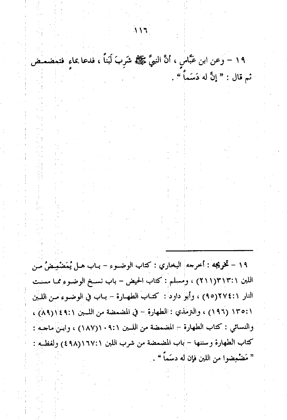 19 - تخريجه: أخرجه البخاري: كتاب الوضوء - باب هل يُمَضْمِضُ من اللبن 1: 313 (211)، ومسلم: كتاب الحيض - باب نسخ الوضوء مما مست النار 1: 274 (95)، وأبو داود: كتاب الطهارة - باب في الوضوء من اللبن 1: 135 (196)، والترمذي: الطهارة - في المضمضة من اللبن 1: 149 (89)، والنسائي: كتاب الطهارة - المضمضة من اللبن 1: 109 (187)، وابن ماجه: كتاب الطهارة وسننها - باب المضمضة من شرب اللبن 1: 167 (498) ولفظه: "مَضْمِضوا من اللبن فإن له دسَمًا".