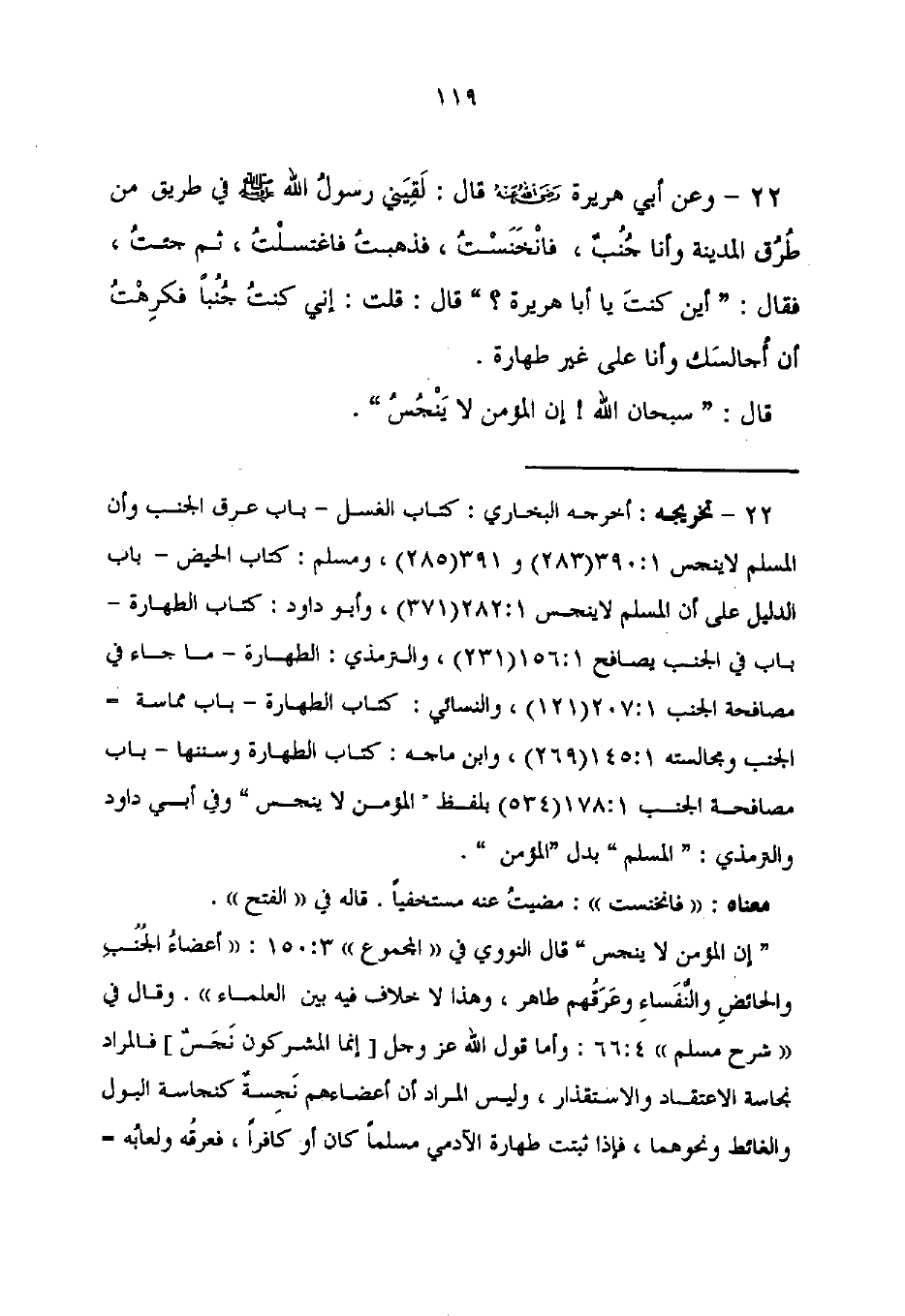 22 - وعن أبي هريرة - رضي الله عنه - قال: لَقِيَني رسولُ الله - صلى الله عليه وسلم - في طريق من طُرُق المدينة وأنا جُنُبٌ، فانْخَنَسْتُ، فذهبتُ فاغتسلْتُ، ثم جئتُ، فقال: "أين كنتَ يا أبا هريرة؟ " قال: قلت: إني كنتُ جُنُبًا فكرِهْتُ أن أُجالسَك وأنا على غير طهارة.