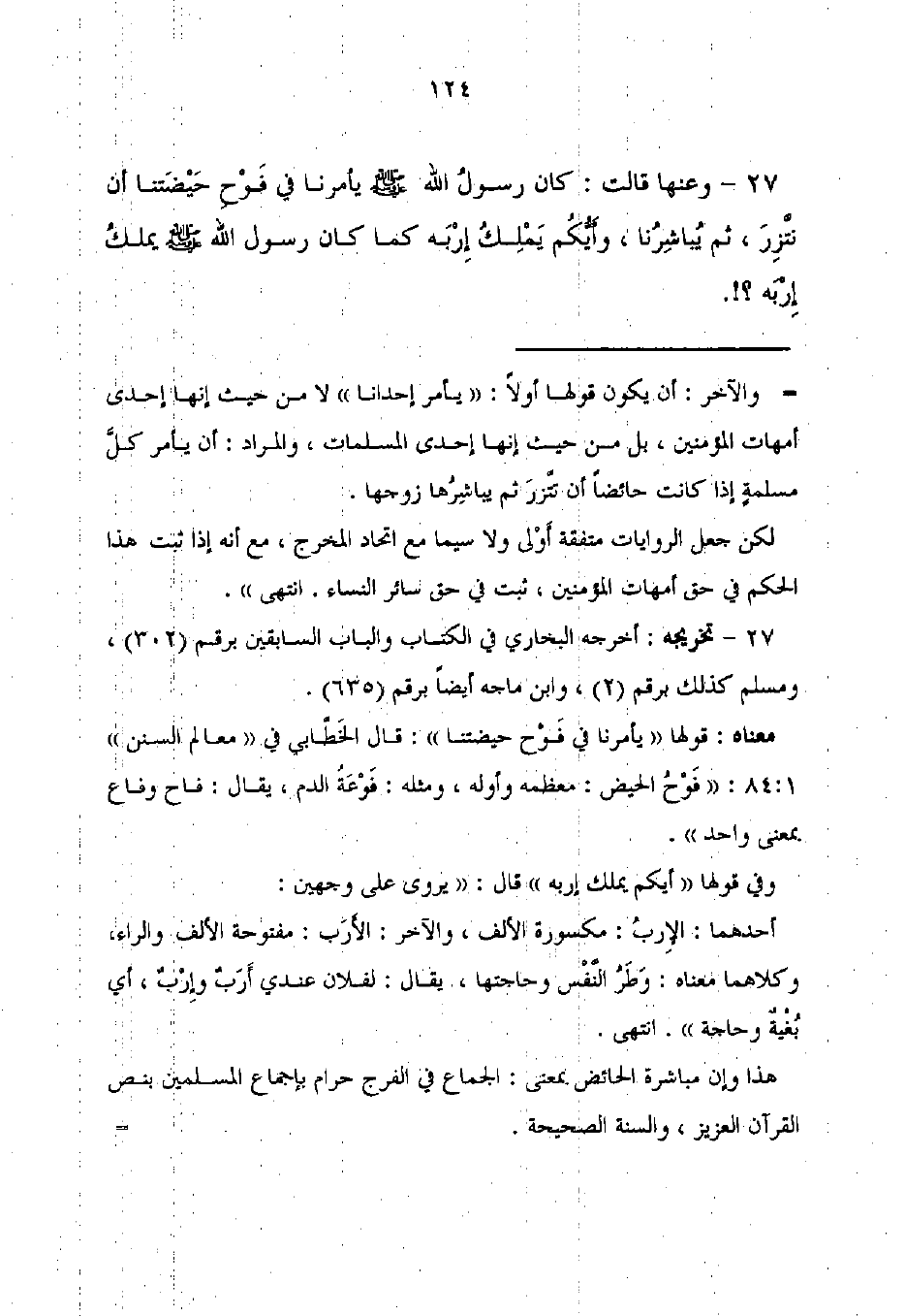 27 - وعنها قالت: كان رسولُ الله - صلى الله عليه وسلم - يأمرنا في فَوْحِ حَيْضَتنا أن نتَّزِرَ، ثم يُباشِرُنا، وأَيُّكُم يَمْلِكُ إِرْبَه كما كان رسول الله - صلى الله عليه وسلم - يملكُ إِرْبَه؟!.