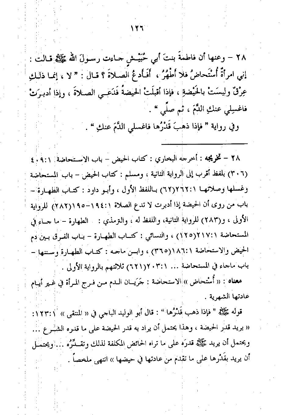 28 - وعنها أن فاطمةَ بنتَ أبي حُبَيْشٍ جاءت رسولَ الله - صلى الله عليه وسلم - قالت: إنى امرأةٌ أُسْتَحاضُ فلا أَطْهُرُ، أفَأَدعُ الصلاةَ؟ قال: "لا، إنما ذلكِ عِرْقٌ وليسَتْ بالحَيْضةِ، فإذا أقبلَتْ الحيضةُ فَدَعي الصلاةَ، وإذا أدبرَتْ فاغسِلي عنكِ الدَّمَ، ثم صلِّي".