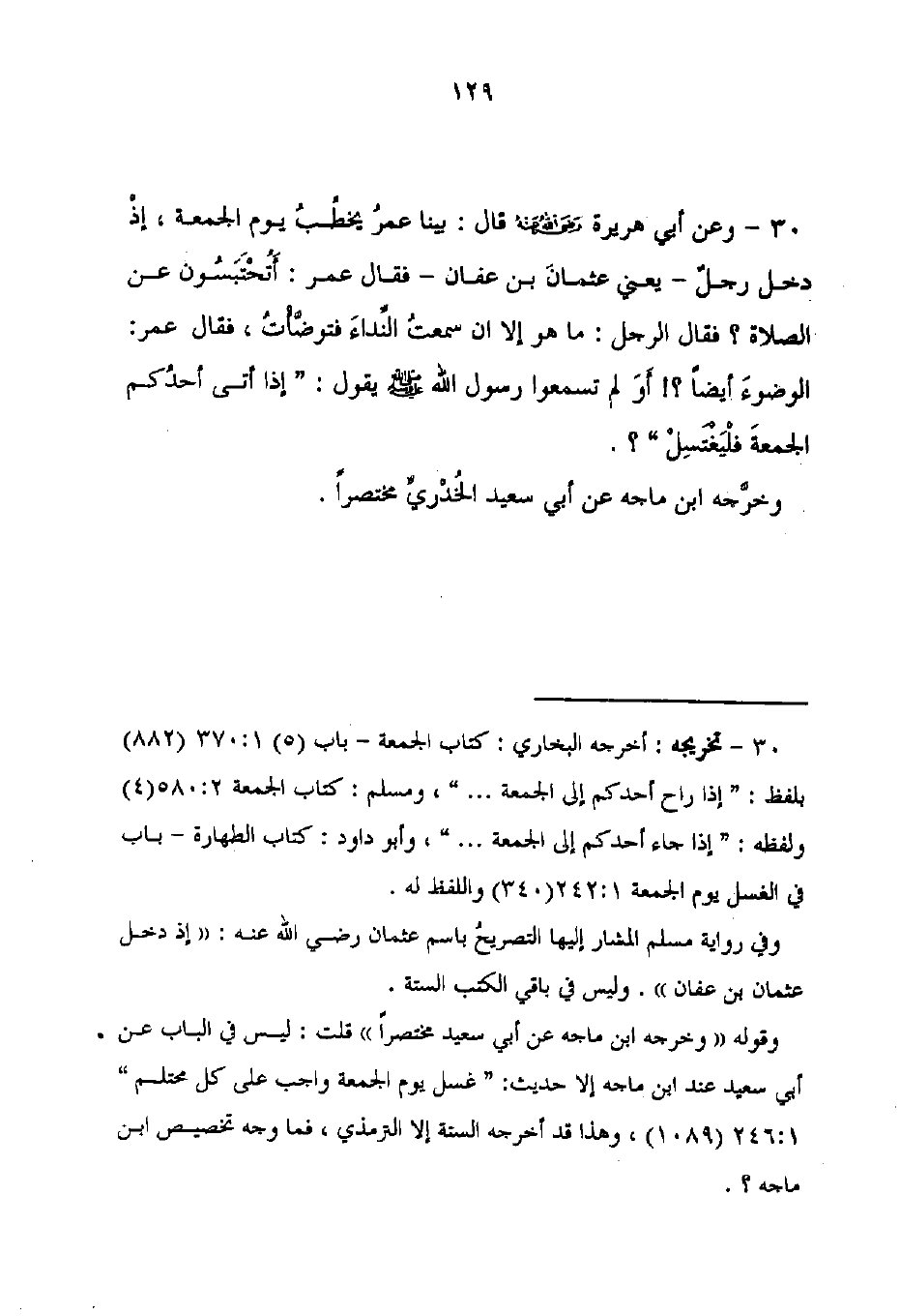 30 - تخريجه: أخرجه البخاري: كتاب الجمعة - باب (5) 1: 370 (882) بلفظ: "إذا راح أحدكم إلى الجمعة. . . ."، ومسلم: كتاب الجمعة 2: 580 (4) ولفظه: "إذا جاء أحدكم إلى الجمعة. . . ."، وأبو داود: كتاب الطهارة - باب في الغسل يوم الجمعة 1: 242 (340) واللفظ له.