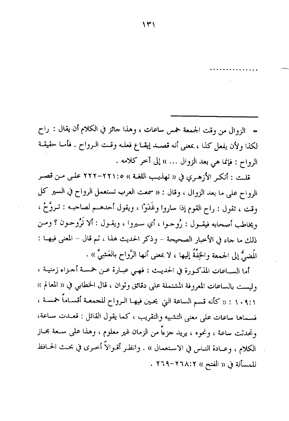 = الزوال من وقت الجمعة خمس ساعات، وهذا جائز في الكلام أن يقال: راح لكذا ولأن يفعل كذا، بمعنى أنه قصد إيقاع فعله وقت الرواح. فأما حقيقة الرواح: فإنما هي بعد الزوال. . . ." إلى آخر كلامه.