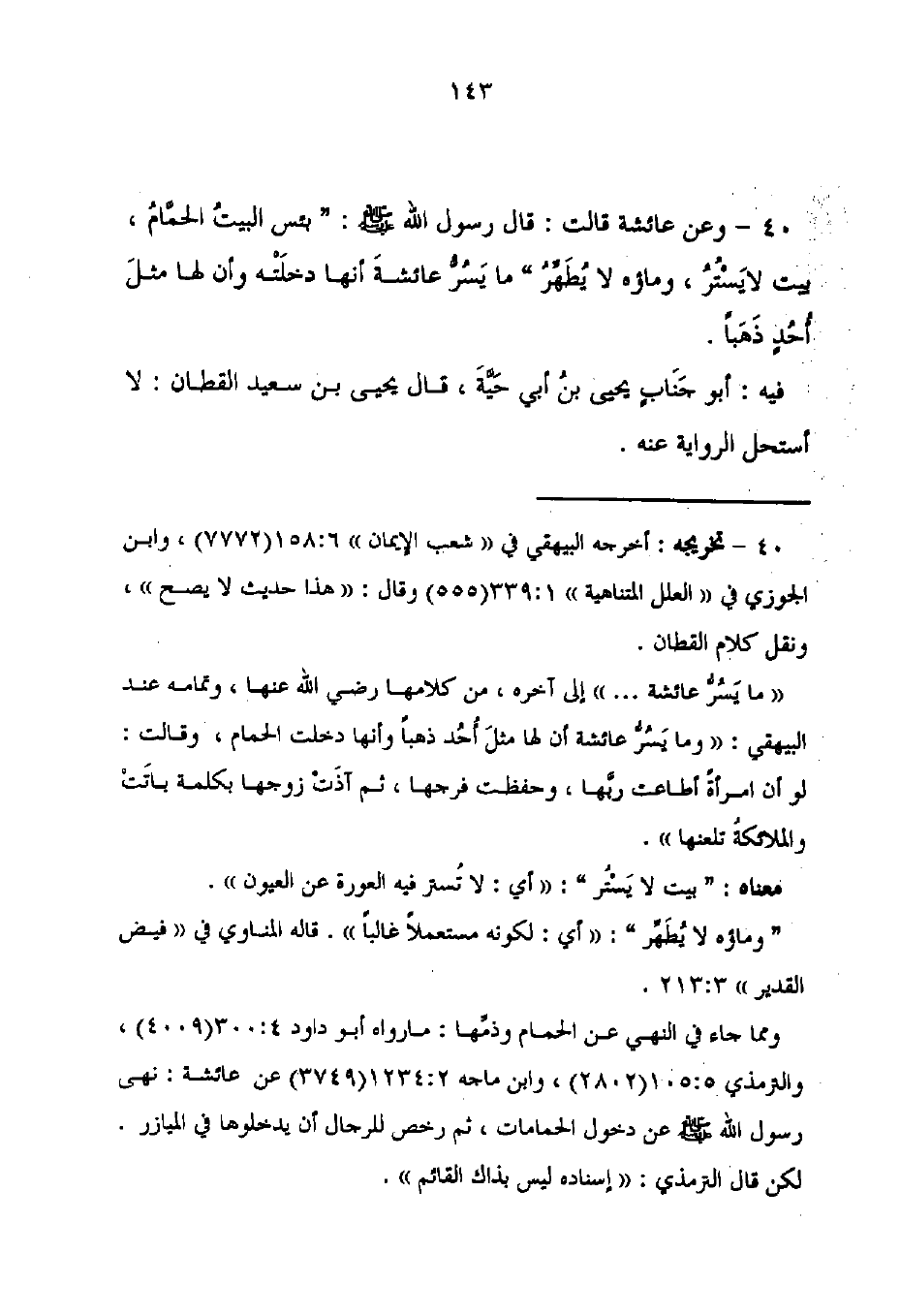 40 - وعن عائشة قالت: قال رسول الله - صلى الله عليه وسلم -: "بئس البيتُ الحمَّامُ، بيت لا يَسْتُرُ، وماؤه لا يُطَهِّرُ" ما يَسُرُّ عائشةَ أنها دخلَتْه وأن لها مثلَ أُحُدٍ ذَهَبًا.