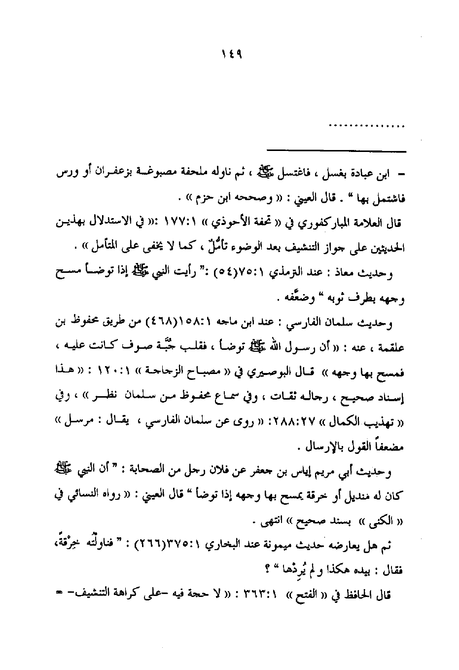 وحديث سلمان الفارسي: عند ابن ماجه 1: 158 (468) من طريق محفوظ بن علقمة، عنه: "أن رسول الله - صلى الله عليه وسلم - توضأ، فقلب جُبَّة صوف كانت عليه، فمسح بها وجهه" قال البوصيرى في "مصباح الزجاجة" 1: 120: "هذا إسناد صحيح، رجاله ثقات، وفي سماع محفوظ من سلمان نظر"، وفي "تهذيب الكمال" 27: 288: "روى عن سلمان الفارسي، يقال: مرسل" مضعفًا القول بالإرسال.