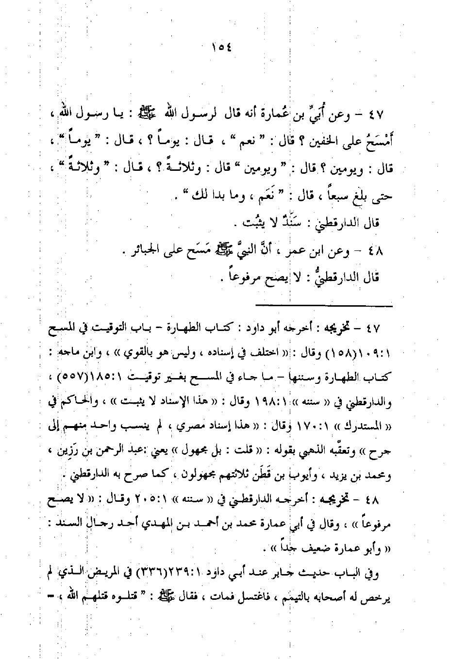 47 - تخريجه: أخرجه أبو داود: كتاب الطهارة - باب التوقيت في المسح 1: 109 (158) وقال: "اختلف في إسناده، وليس هو بالقوي"، وابن ماجه: كتاب الطهارة وسننها - ما جاء في المسح بغير توقيت 1: 185 (557)، والدارقطنى في "سننه" 198: 1 وقال: "هذا الإسناد لا يثبت"، والحاكم في "المستدرك" 1: 170 وقال: "هذا إسناد مصري، لم ينسب واحد منهم إلى جرح" وتعقَّبه الذهبي بقوله: "قلت: بل مجهول" يعني: عبد الرحمن بن رَزِين، ومحمد بن يزيد، وأيوب بن قَطَن ثلاثتهم مجهولون، كما صرح به الدارقطني.