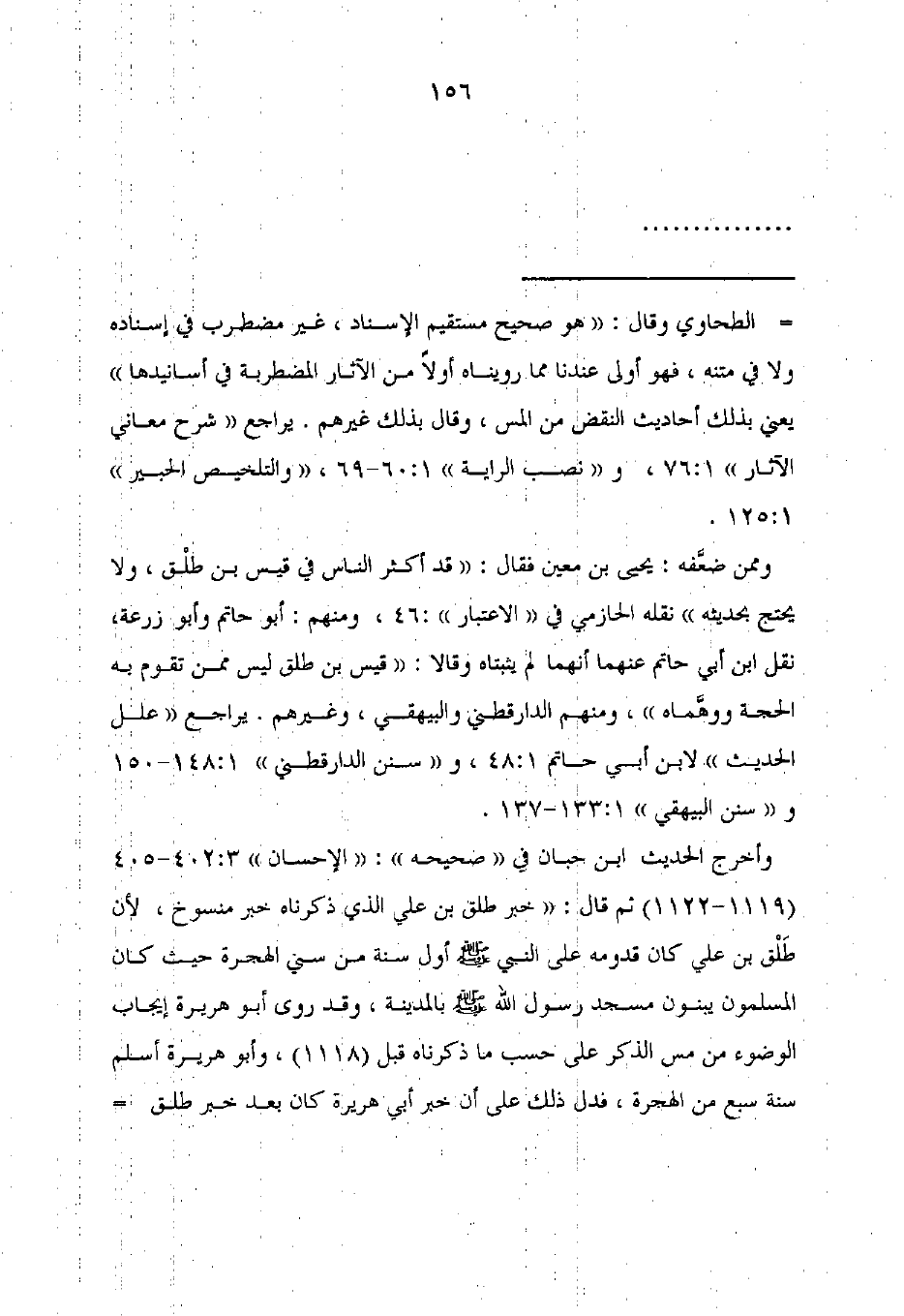 = الطحاوي وقال: "هو صحيح مستقيم الإسناد، غير مضطرب في إسناده ولا في متنه، فهو أولى عندنا مما رويناه أولًا من الآثار المضطربة في أسانيدها" يعني بذلك أحاديث النقض من المس، وقال بذلك غيرهم. يراجع "شرح معاني الآثار" 1: 76، و"نصب الراية" 1: 60 - 69، "والتلخيص الحبير" 125: 1.
