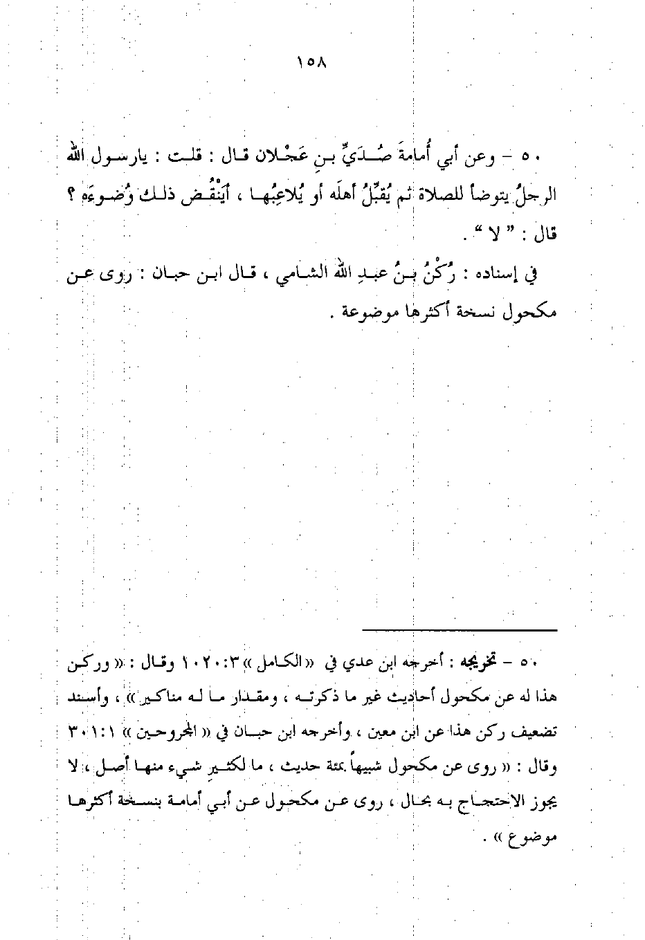 50 - تخريجه: أخرجه ابن عدي في "الكامل" 3: 1020 وقال: "وركن هذا له عن مكحول أحاديث غير ما ذكرته، ومقدار ما له مناكير"، وأسند تضعيف ركن هذا عن ابن معين، وأخرجه ابن حبان في "المجروحين" 1: 301 وقال: "روى عن مكحول شبيهًا بمئة حديث، ما لكثيرِ شئ منها أصل، لا يجوز الاحتجاج به بحال، روى عن مكحول عن أبي أمامة بنسخة أكثرها موضوع".