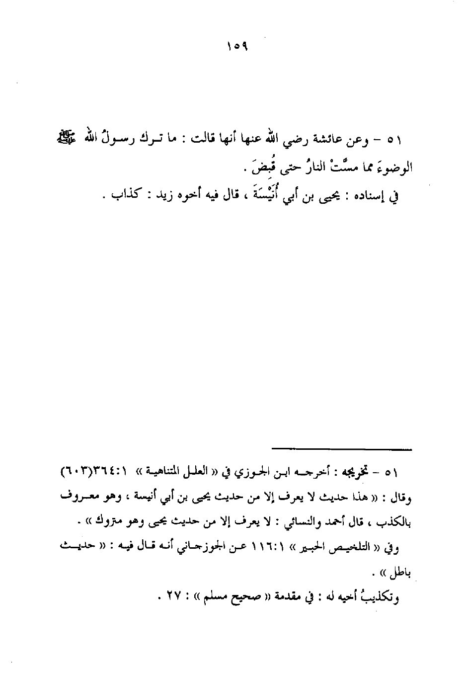 51 - تخريجه: أخرجه ابن الجوزي في "العلل المتناهية" 1: 364 (603) وقال: "هذا حديث لا يعرف إلا من حديث يحيى بن أبي أنيسة، وهو معروف بالكذب، قال أحمد والنسائى: لا يعرف إلا من حديث يحيى وهو متروك".