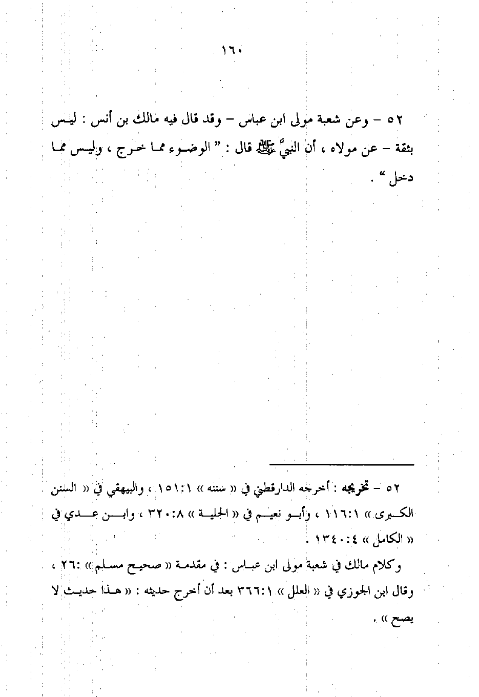 52 - وعن شعبة مولى ابن عباس -وقد قال فيه مالك بن أنس: ليس بثقة- عن مولاه، أن النبيَّ - صلى الله عليه وسلم - قال: "الوضوء مما خرج، وليس مما دخل".