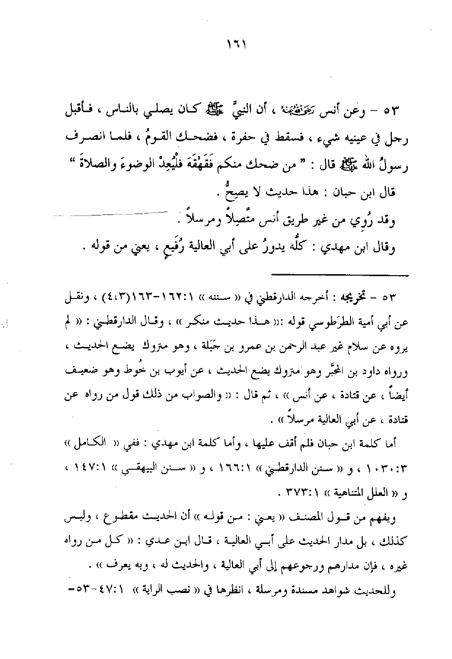 53 - وعن أنس - رضي الله عنه -، أن النبيَّ - صلى الله عليه وسلم - كان يصلى بالناس، فأقبل رجل في عينيه شيء، فسقط في حفرة، فضحك القومُ، فلما انصرف رسولُ الله - صلى الله عليه وسلم - قال: "من ضحك منكم فَقَهْقَهَ فلْيُعِدْ الوضوءَ والصلاةَ"