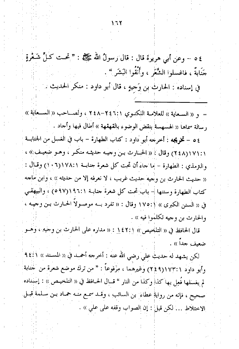 54 - تخريجه: أخرجه أبو داود: كتاب الطهارة - باب في الغسل من الجنابة 1: 171 (248) وقال: "الحارث بن وجيه حديثه منكر، وهو ضعيف"، والترمذي: الطهارة - ما جاء أن تحت كل شعرة جنابة 1: 178 (106) وقال: "حديث الحارث بن وجيه حديث غريب، لا نعرفه إلا من حديثه"، وابن ماجه كتاب الطهارة وسننها - باب تحت كل شعرة جنابة 1: 196 (597)، والبيهقى في "السنن الكبري" 1: 175 وقال: "تفرد به موصولًا الحارث بن وجيه، والحارث بن وجيه تكلموا فيه".
