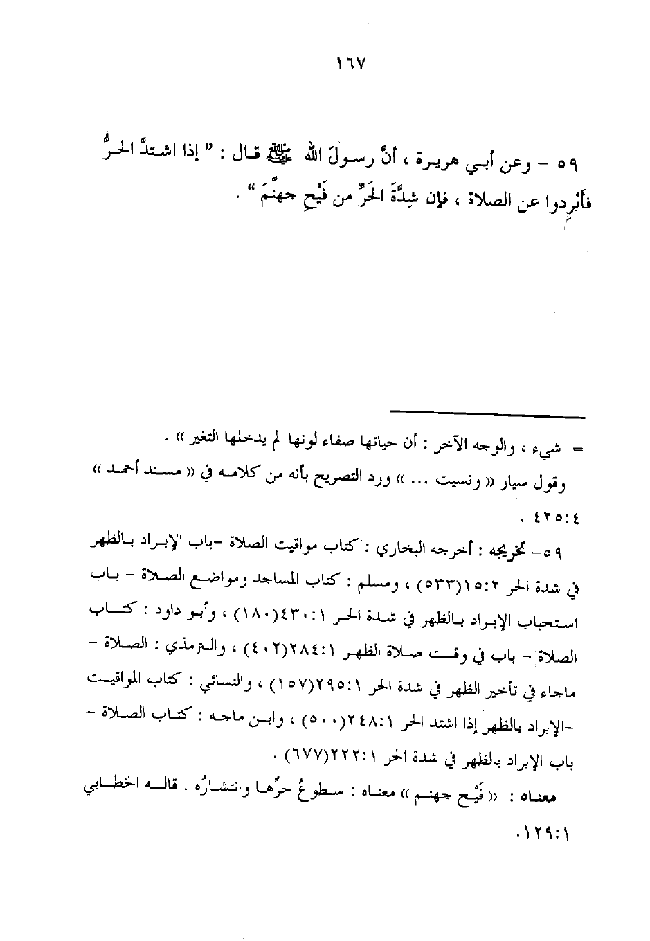 59 - رعن أبي هريرة، أنَّ رسولَ الله - صلى الله عليه وسلم - قال: "إذا اشتدَّ الحرُّ فأَبْردوا عن الصلاة، فإن شِدَّةَ الحَرِّ من فَيْح جهنَّمَ".