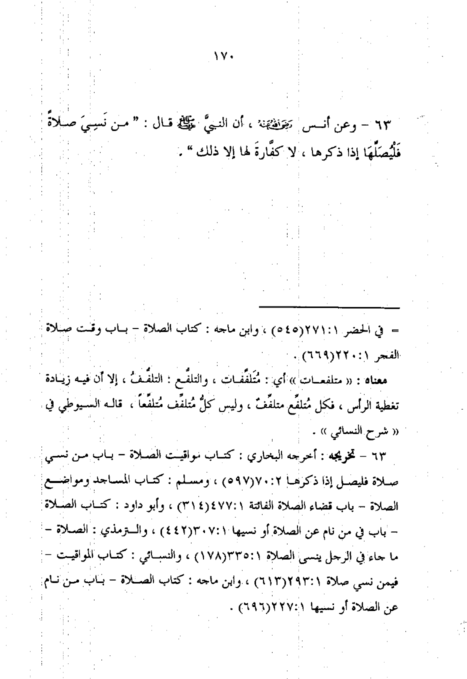 63 - وعن أنس - رضي الله عنه -، أن النبيَّ - صلى الله عليه وسلم - قال: "من نَسِيَ صلاةً فَلْيُصَلِّهَا إذا ذكرها، لا كفَّارةَ لها إلا ذلك".