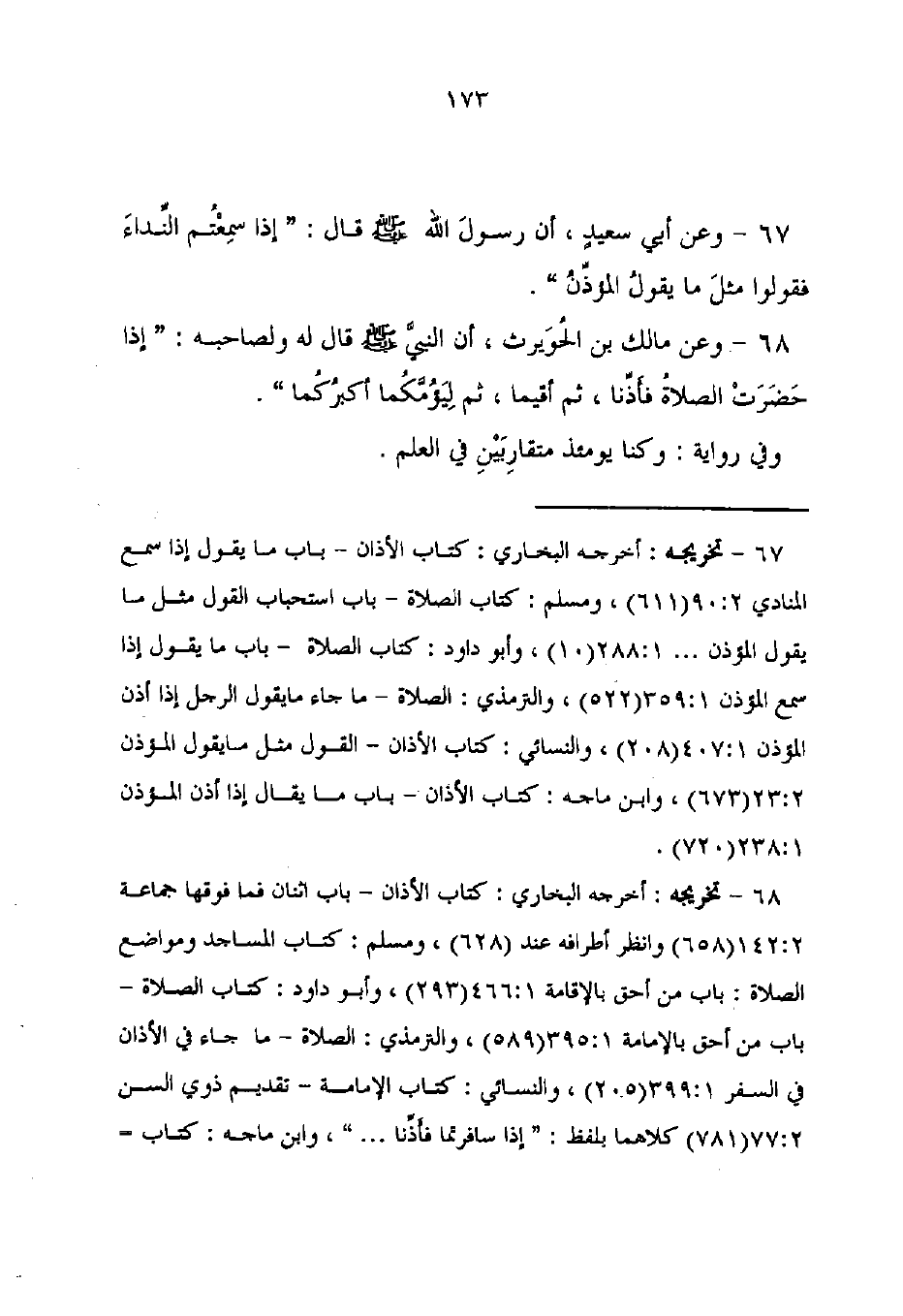 67 - تخريجه: أخرجه البخاري: كتاب الأذان - باب ما يقول إذا سمع المنادي 2: 90 (611)، ومسلم: كتاب الصلاة - باب استحباب القول مثل ما يقول المؤذن ... 1: 288 (10)، وأبو داود: كتاب الصلاة - باب ما يقول إذا سمع المؤذن 1: 359 (522)، والترمذي: الصلاة - ما جاء ما يقول الرجل إذا أذن المؤذن 1: 407 (208)، والنسائيُّ: كتاب الأذان - القول مثل ما يقول المؤذن 2: 23 (673)، وابن ماجه: كتاب الأذان - باب ما يقال إذا أذن المؤذن 1: 238 (720).