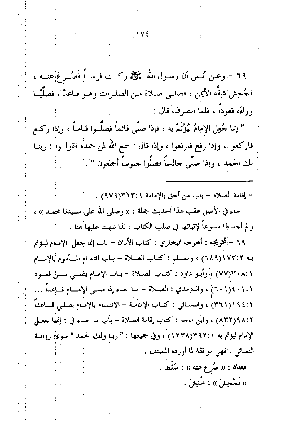 69 - وعن أنس أن رسول الله - صلى الله عليه وسلم - ركب فرسًا فَصُرِعَ عنه، فجُحِش شِقُّه الأيمن، فصلى صلاة من الصلوات وهو قاعدٌ، فصلَّيْنا وراءَه قعودًا، فلما انصرف قال:
