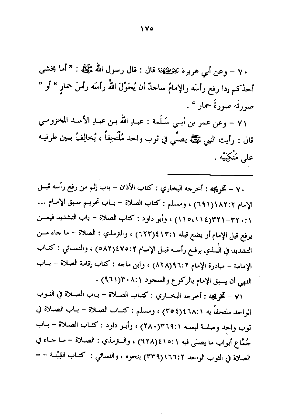 70 - تخريجه: أخرجه البخاري: كتاب الأذان - باب إثم من رفع رأسه قبل الإمام 2: 182 (691)، ومسلم: كتاب الصلاة - باب تحريم سبق الإمام. . . 1: 320 - 321 (114، 115)، وأبو داود: كتاب الصلاة - باب التشديد فيمن يرفع قبل الإمام أو يضع قبله 1: 413 (623)، والترمذي: الصلاة - ما جاء من التشديد في الذي يرفع رأسه قبل الإمام 2: 475 (582)، والنسائي: كتاب الإمامة - مبادرة الإمام 2: 96 (828)، وابن ماجه: كتاب إقامة الصلاة - باب النهي أن يسبق الإمام بالركوع والسجود 1: 308 (961).