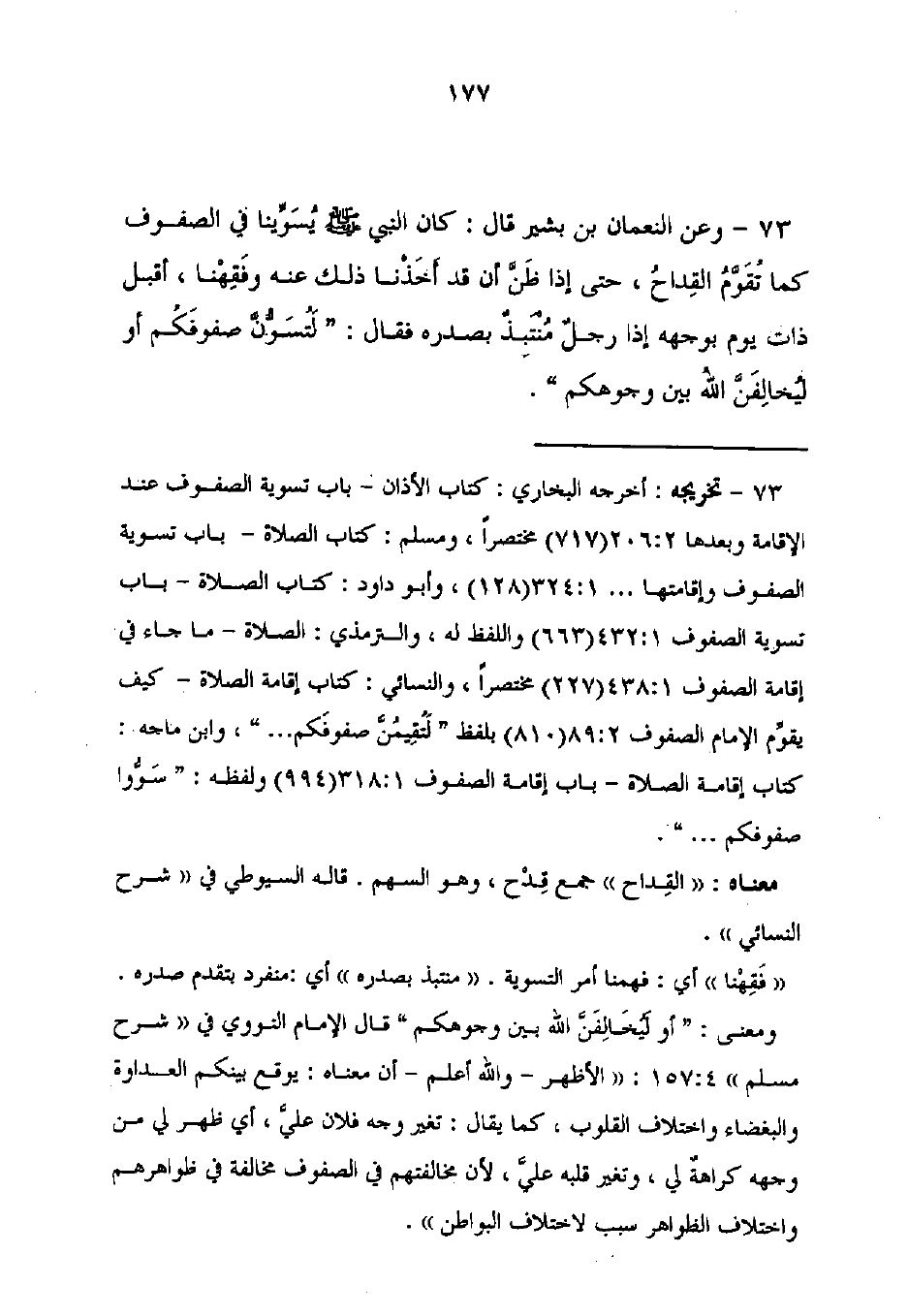 73 - وعن النعمان بن بشير قال: كان النبي - صلى الله عليه وسلم - يُسَوِّينا في الصفوف كما تُقَوَّمُ القِداحُ، حتى إذا ظَنَّ أن قد أَخَذْنا ذلك عنه وفَقِهْنا، أقبل ذات يوم بوجهه إذا رجلٌ مُنْتَبِذٌ بصدره فقال: "لَتُسَوُّنَّ صفوفَكُم أو ليُخالِفَنَّ اللهُ بين وجوهكم".
