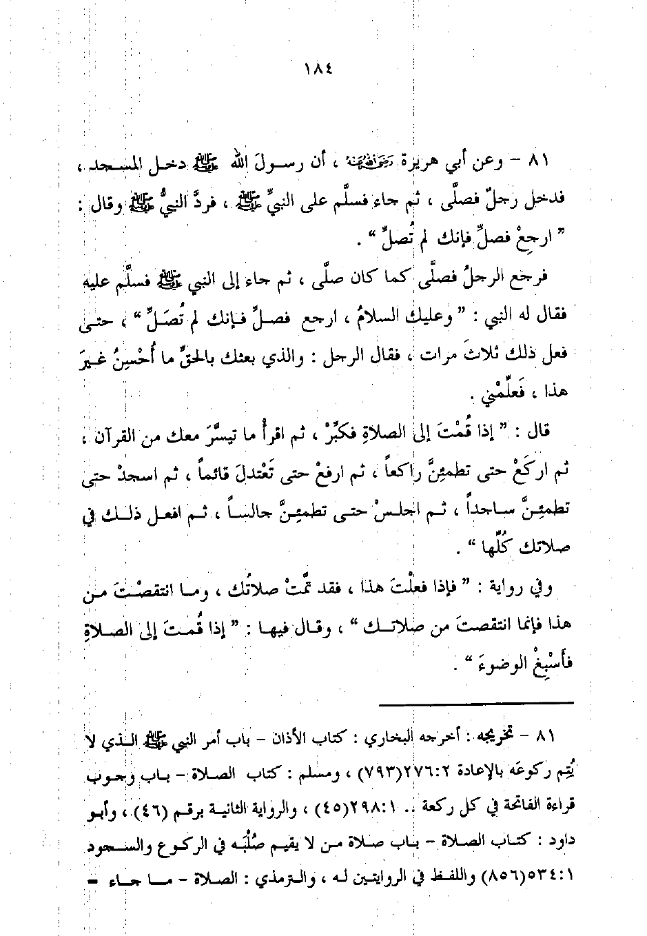 81 - وعن أبي هريرة - رضي الله عنه -، أن رسولَ الله - صلى الله عليه وسلم - دخل المسجد، فدخل رجلٌ فصلَّى، ثمَّ جاء فسلَّم على النبيِّ - صلى الله عليه وسلم -، فردَّ النبيُّ - صلى الله عليه وسلم - وقال: "ارجِعْ فصلِّ فإنك لم تُصلِّ".
