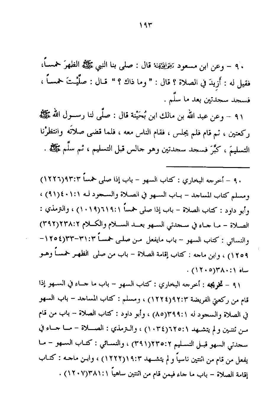 90 - أخرجه البخاري: كتاب السهو - باب إذا صلى خمسًا 3: 93 (1226) ومسلم كتاب المساجد - باب السهو في الصلاة والسجود له 1: 401 (91)، وأبو داود: كتاب الصلاة - باب إذا صلى خمسًا 1: 619 (1019)، والترمذى: الصلاة - ما جاء في سجدتي السهو بعد السلام والكلام 238: 2 (392) والنسائى: كتاب السهو - باب ما يفعل من صلى خمسًا 3: 31 - 33 (1254 - 1259)، وابن ماجه: كتاب إقامة الصلاة - باب من صلى الظهر خمسًا وهو ساه 1: 380 (1205).