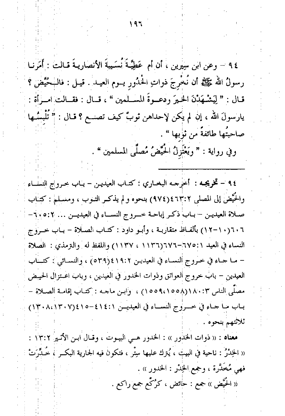 94 - وعن ابن سِيرين، أن أم عَطِيَّةَ نُسَيبةَ الأنصاريةَ قالت: أمَرنا رسولُ الله - صلى الله عليه وسلم - أن نُخْرِجَ ذواتِ الخدُورِ يوم العيد. قيل: فالحُيَّض؟ قال: "لِيَشْهَدْنَ الخيرَ ودعوةَ المسلمين"، قال: فقالت امرأة: يا رسولَ الله، إن لم يكن لإحداهن ثوبٌ كيف تصنع؟ قال: "تُلْبِسُها صاحبتُها طائفة من ثوبِها".