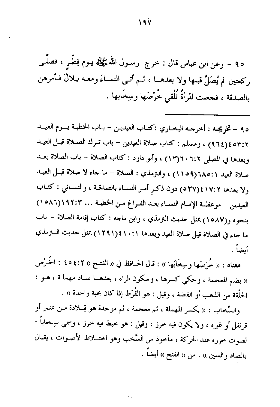 95 - وعن ابن عباس قال: خرج رسول الله - صلى الله عليه وسلم - يوم فِطْر، فصلَّى ركعتين لم يُصَلِّ قبلها ولا بعدها، ثم أتى النساءَ ومعه بلالٌ فأمرهن بالصدقة، فجعلت المرأةُ تُلْقي خُرْصَها وسِخَابها.