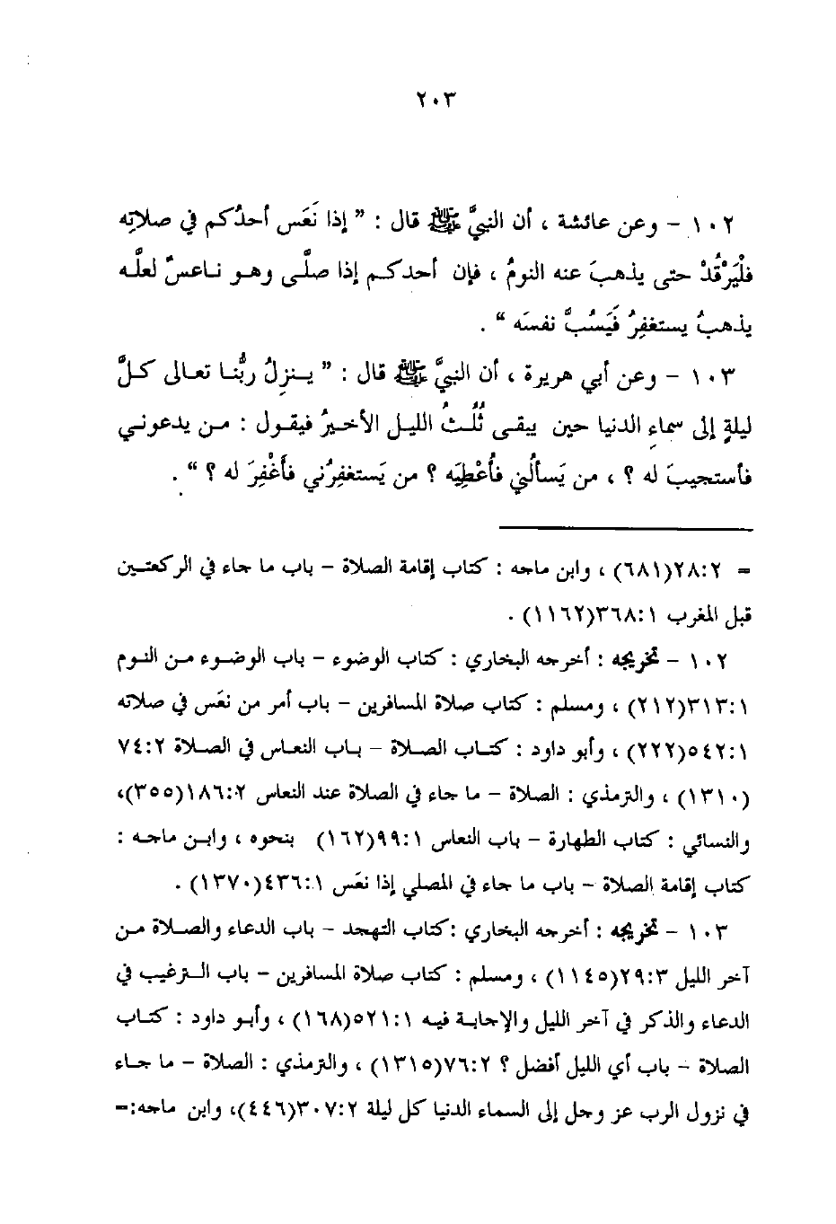 103 - تخريجه: أخرجه البخاري: كتاب التهجد - باب الدعاء والصلاة من آخر الليل 3: 29 (1145)، ومسلم: كتاب صلاة المسافرين - باب الترغيب في الدعاء والذكر في آخر الليل والإجابة فيه 1: 521 (168)، وأبو داود: كتاب الصلاة - باب أي الليل أفضل؟ 2: 76 (1315)، والترمذي: الصلاة - ما جاء في نزول الرب عز وجل إلى السماء الدنيا كل ليلة 307: 2 (446)، وابن ماجه: =