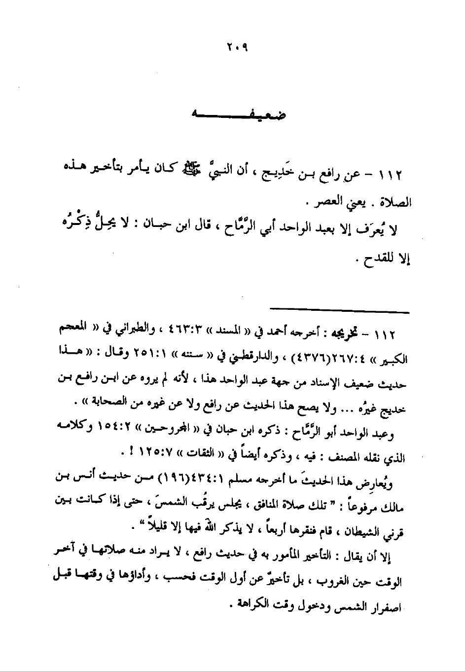 112 - تخريجه: أخرجه أحمد في "المسند" 3: 463، والطبراني في "المعجم الكبير" 4: 267 (4376)، والدارقطني في "سننه" 1: 251 وقال: "هذا حديث ضعيف الإسناد من جهة عبد الواحد هذا، لأنه لم يروه عن ابن رافع بن خديج غيرُه ... ولا يصح هذا الحديث عن رافع ولا عن غيره من الصحابة".