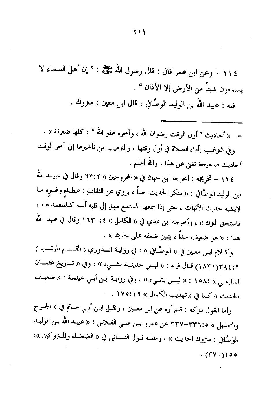 114 - تخريجه: أخرجه ابن حبان في "المجروحين" 63: 2 وقال في عبيد الله ابن الوليد الوصَّافي: "منكر الحديث جدًّا، يروي عن الثقات: عطاء وغيرِه ما لا يشبه حديث الأثبات، حتى إذا سمعها المستمع سبق إلى قلبه أنه كالمتعمد لها، فاستحق الترك"، وأخرجه ابن عدي في "الكامل" 4: 1630 وقال في عبيد الله هذا: "هو ضعيف جدًّا، يتبين ضعفه على حديثه".