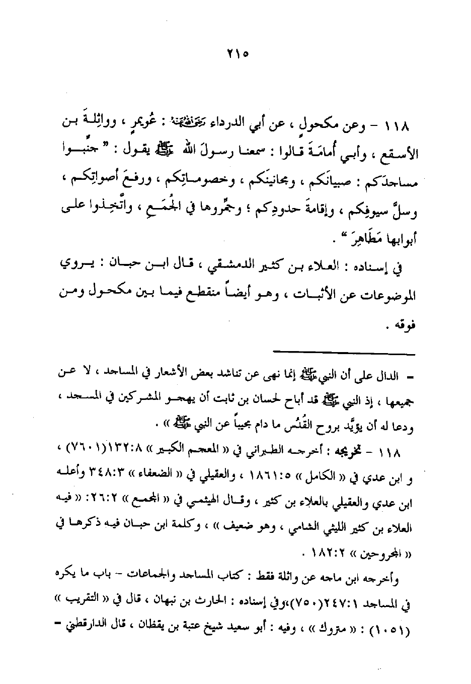 118 - وعن مكحول، عن أبي الدرداء - رضي الله عنه -: عُويمر، وواثِلةَ بن الأسقع، وأبي أمامةَ قالوا: سمعنا رسول الله - صلى الله عليه وسلم - يقول: "جنبوا مساجدَكم: صبيانَكم، ومجانينَكم، وخصوماتِكم، ورفعَ أصواتِكم، وسل سيوفِكم، وإقامةَ حدودِكم؛ وجمِّروها في الجُمَع، واتخِذوا على أبوابها مَطَاهِرَ".