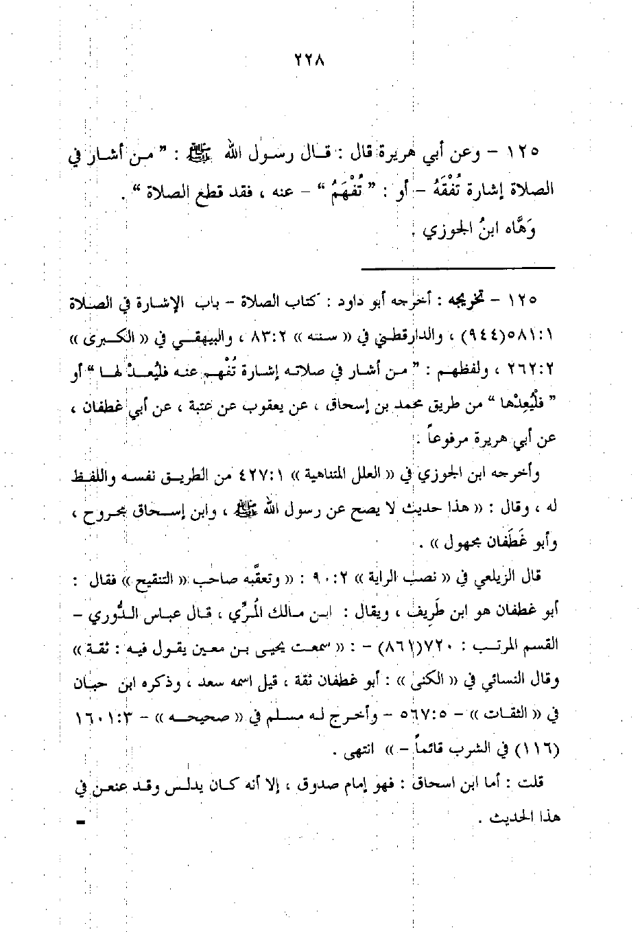 125 - تخريجه: أخرجه أبو داود: كتاب الصلاة - باب الإشارة في الصلاة 1: 581 (944)، والدارقطنى في "سننه" 2: 83، والبيهقى في "الكبرى" 262: 2، ولفظهم: "من أشار في صلاته إشارة تُفْهم عنه فليُعدْ لها" أو "فلْيُعِدْها" من طريق محمد بن إسحاق، عن يعقوب عن عتبة، عن أبي غطفان، عن أبي هريرة مرفوعًا.