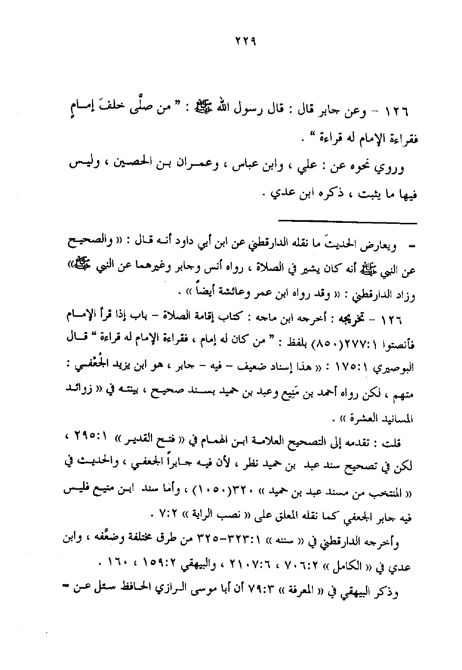 126 - وعن جابر قال: قال رسول الله - صلى الله عليه وسلم -: "من صلَّى خلفَ إمامٍ فقراءة الإمام له قراءة".