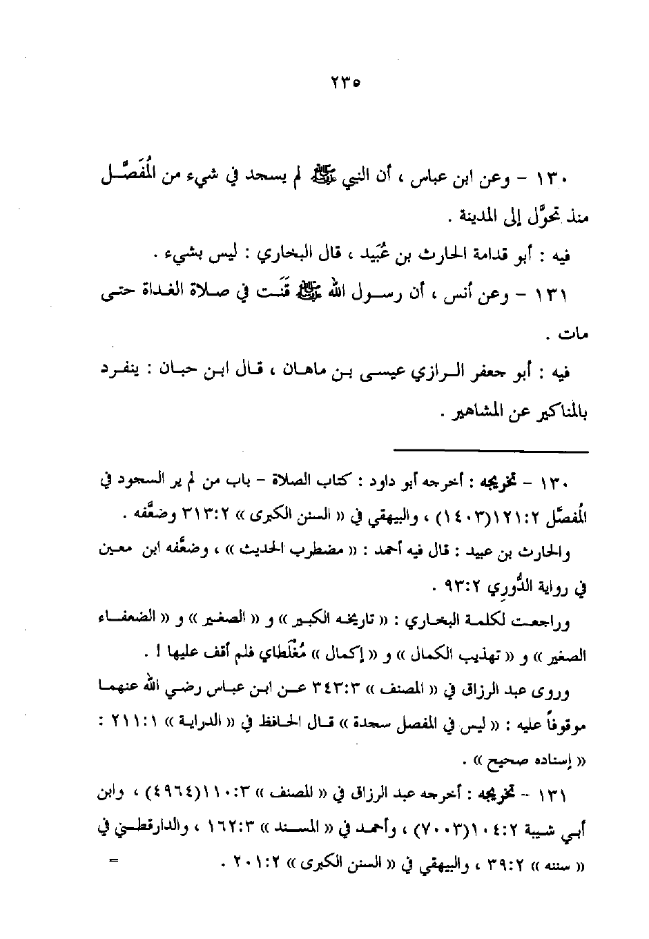 130 - تخريجه: أخرجه أبو داود: كتاب الصلاة - باب من لم ير السجود في المُفصَّل 2: 121 (1403)، والبيهقى في "السنن الكبرى" 2: 313 وضعَّفه.