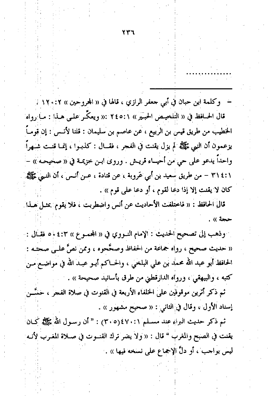 ثم ذكر حديث البراء عند مسلم 1: 470 (305): "أن رسول الله - صلى الله عليه وسلم - كان يقنت في الصبح والمغرب" قال: "ولا يضر ترك القنوت في صلاة المغرب لأنه ليس بواحب، أو دلَّ الإجماع على نسخه فيها".