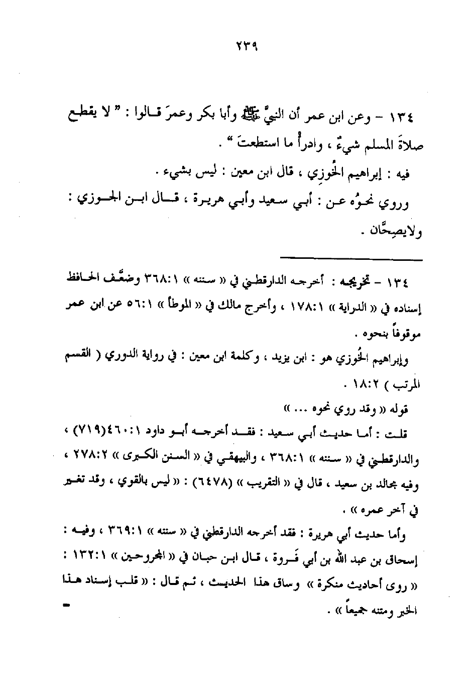 134 - تخريجه: أخرجه الدارقطني في "سننه" 1: 368 وضعَّف الحافظ إسناده في "الدراية" 1: 178، وأخرج مالك في "الموطأ" 1: 56 عن ابن عمر موقوفًا بنحوه.
